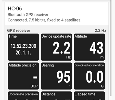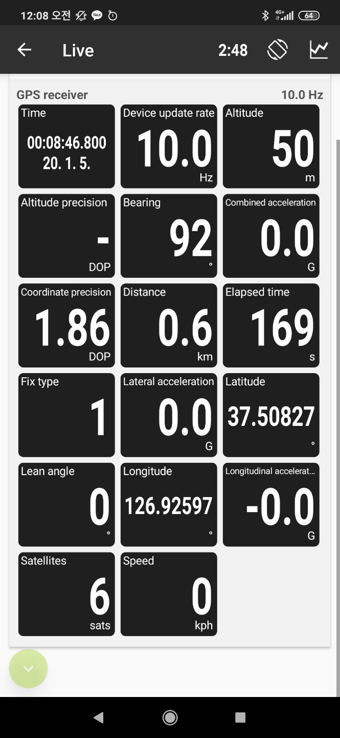 10hz로 잘 통신이 되고 있으며 걸어다닐때는 4~5kph, 적당히 달리면 9~10kph가 측정됩니다.