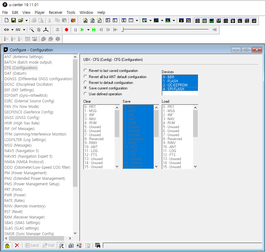 4. 이 상태에서 u-center의 config탭에서 설정 저장을 하면 이부분은 적용되지 않는다.