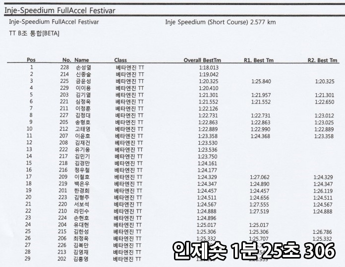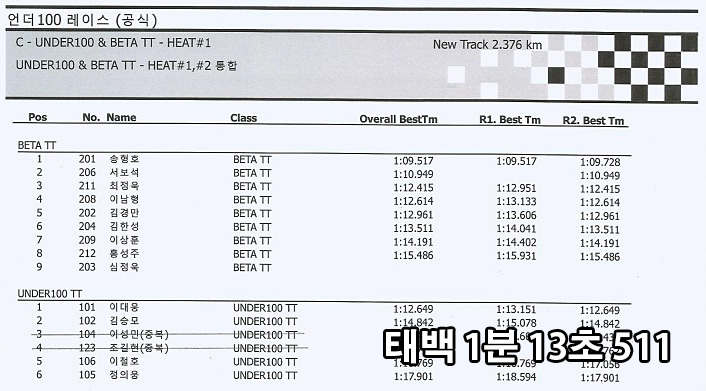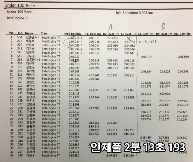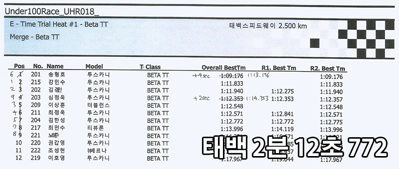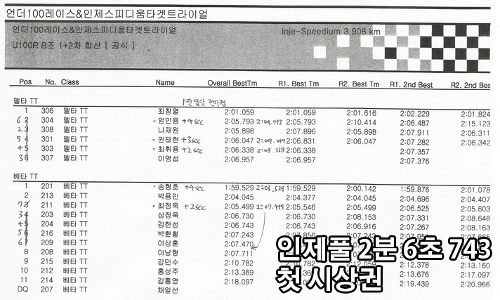 나는 초보자이니까(사실 스프린트로 가기엔 너무나 이런저런 돈의 장비의 장벽이 크다) 베타TT로 출전했다. 처음치고는 나름대로 잘 달렸다고 생각했었다. 가보면 우렁찬 소리와 함께 뭔가 엄청난 튠이 되어있는 듯한 차들도 많았는데 그 틈바구니에 거의 아무것도 안된 차로 달려서 중간쯤 갔으면 처음치고는 그럭저럭 괜찮은 성적이 아니었다 생각이 들었다.