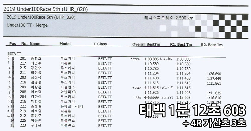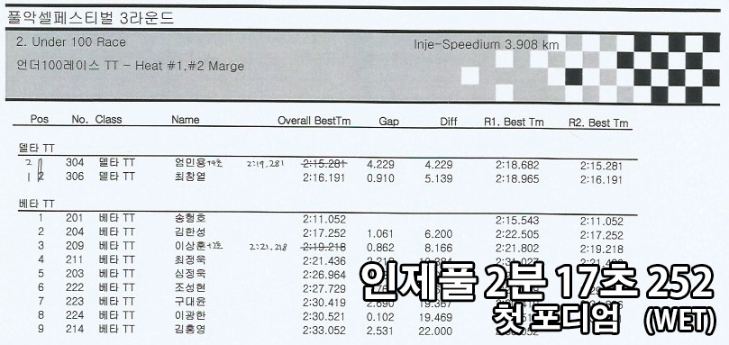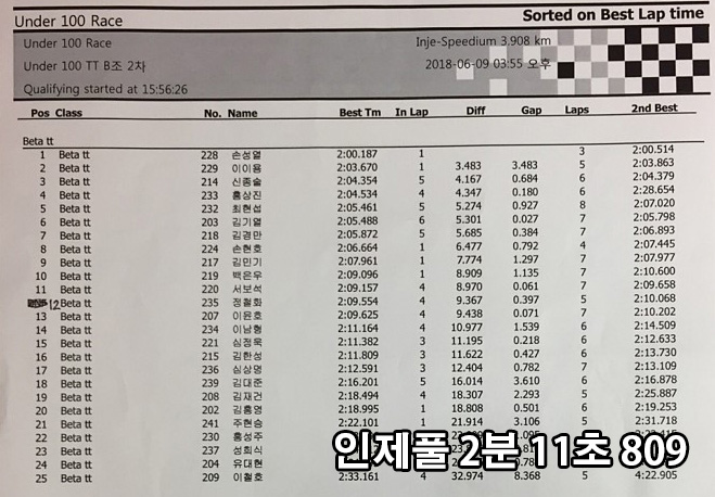 인제 풀코스 2분 13초 193을 기록하였고 첫 출전이었던 2017년 3라운드 대비 거의 3초 가깝게 랩타임을 단축시켰다. 하지만 이게 튠의 효과인지 코스에 익숙해져인지는 알 수 없다. 아마 둘 다 영향을 줬겠지.. 하지만 목표했던 순위 반타작은 여전히 실패..