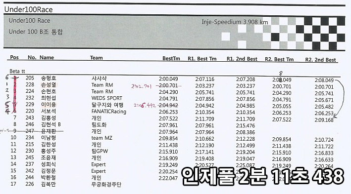 언더100레이스 초기에 꿈에서나 볼듯한 2분 3초를 찍었다는게 뿌듯했다.