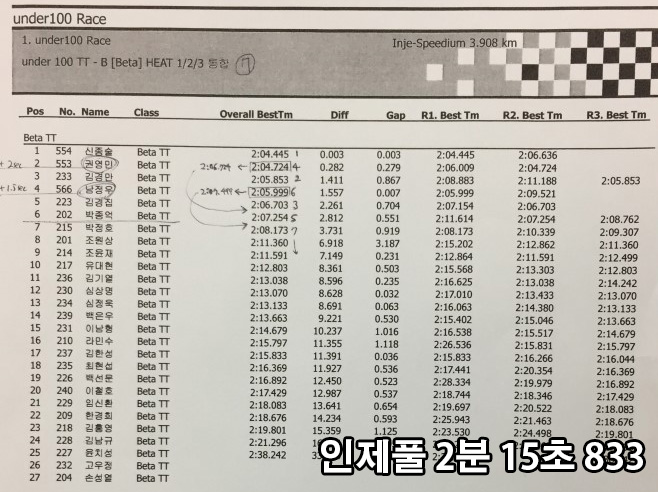 물론 슬프게도 이날 공식 기록지에서 2분 9초 기록은 사라졌다. 이날 기록지에 내가 숏컷을 했다고 판정이 되었고 베렙이 삭제가 되었다. 솔직히 레이스크로노를 영상을 돌려봐도 숏컷은 없었던 것 같은데, 어차피 내가 순위권에 있을 것도 아니고, 나의 레이스는 내 자신과의 싸움인데 굳이 이의제기해도 뭐 그닥 얻을게 없으니까.. 그저 2분 9초대 진입해서 드디어 반타작을 했구나.. 하는 소득으로 집에 왔다.