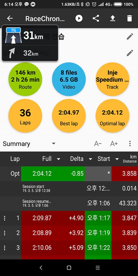 이날 주행하면서 주행 중에 코멘트를 받을 수 있는 기회가 있었는데, 상당히 재미있고 텐션 유지하는데 도움이 되었다. 누군가 옆에서 지켜보고 있다고 생각하니 좀 더 긴장의 끈을 놓지 않을 수 있었고, 어떤 부분에서 어떻게 해보면 좋겠다는 코칭이 메시지로 들어오면서 그 부분에 집중해서 타다보니 열흘전에 탔던 랩보다 다시 0.6초를 줄일 수 있게 되었다.