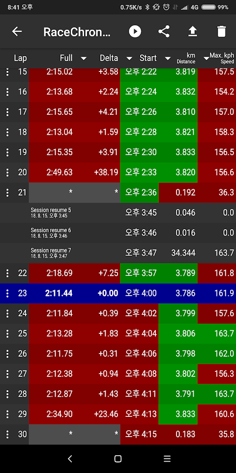 레슨받은 대로 라인에 집중하기 위해 손발에 익지 않은 기어 변경 말고 그동안 타오던 방식으로 랩을 돌았는데, 개인적으로 목표했던 2분 10초의 벽을 깼다. 2분 9초대가 찍히게 된 것이다.