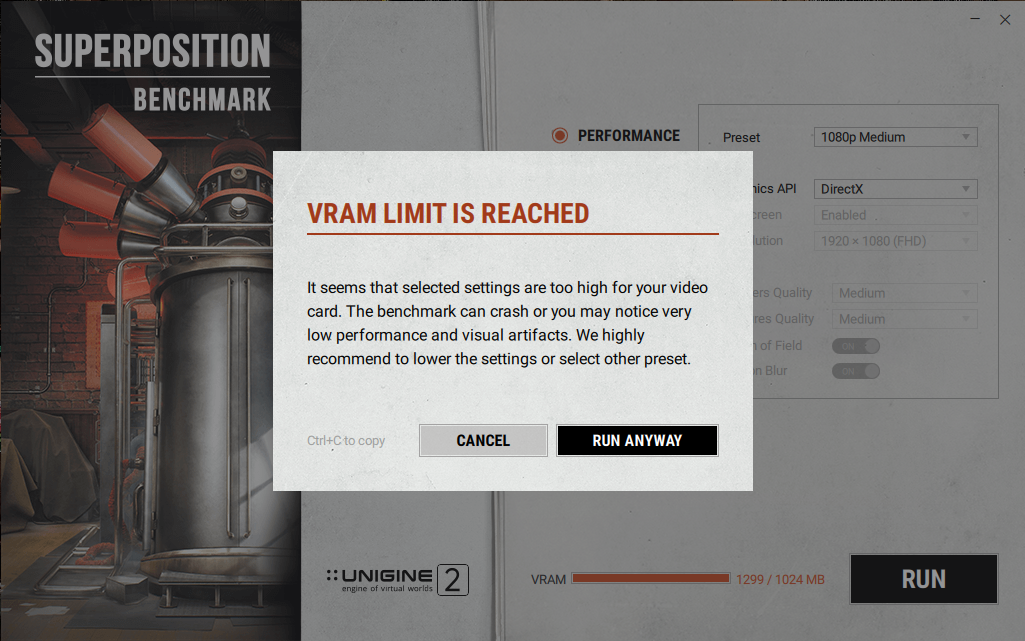 1080p Medium을 테스트 하는데도 VRAM이 모자란다고 한다.. 불쌍.. 그래도 RUN ANYWAY가 있으니까 누르고 돌렸다.
