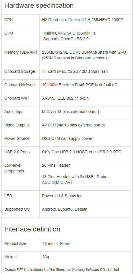 오렌지파이 제로 LTS 버전은 오렌지파이 제로버전의 발열을 조금 더 해결한 버전이다. 스펙은 위 그림과 같다.