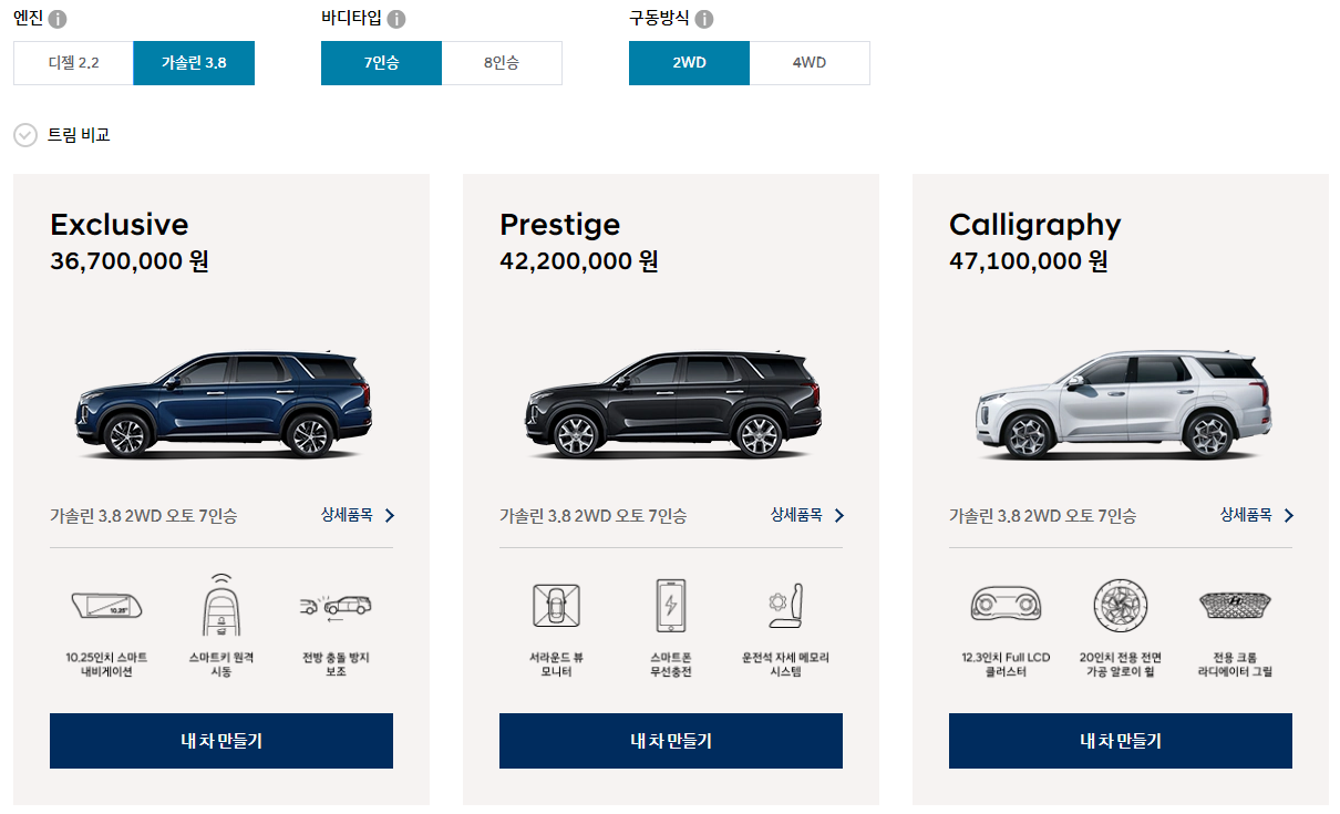 그렇다. 내가 필요한 조건으로는 쏘렌토보다 되려 팰리세이드가 싸다..