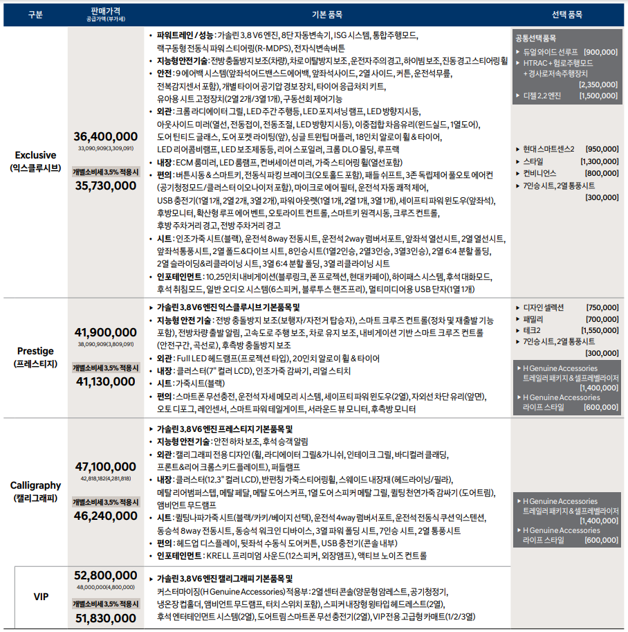 | [등급] 3570만원 노블레스 2.5T ㄴ 메모리 시트 ㄴ LED 테일램프 ㄴ ECM룸미러 [옵션] 합계 523만원 - 스화펄 8 - 파썬 115 - 네비 95 - 스타일 95 - 드라이브와이즈 90 - 6인승 120 [합계] 4093만원 |