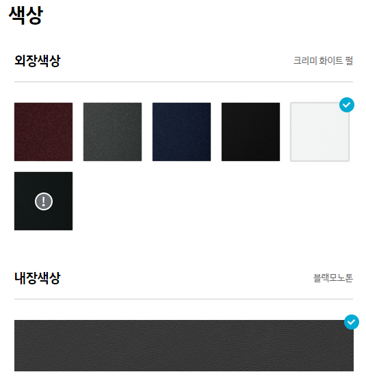 색상의 경우는 원래 이차 처음 나왔을때 흰색이 이쁘다고 생각했었는데.. 최근에 무채색 차량 그만타고 싶다고 생각했었으나.. 문라이트블루가 어두운 톤이기 때문에 외장관리가 어려워서 포기했다. (검은색은 아예 배제) 그렇다고 레드계열 색상은 내 취향이랑 너무 안맞고 칙칙한 그레이톤 하느니 그냥 흰차를 뽑기로..
