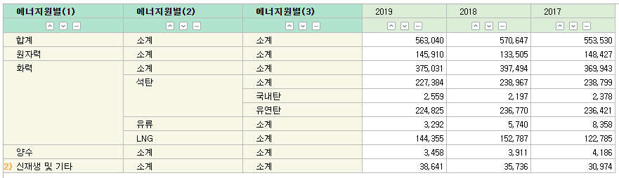한편 대한민국 에너지원별 발전량 통계자료를 보면, 2019년의 총 발전량은 563,040GWh다.