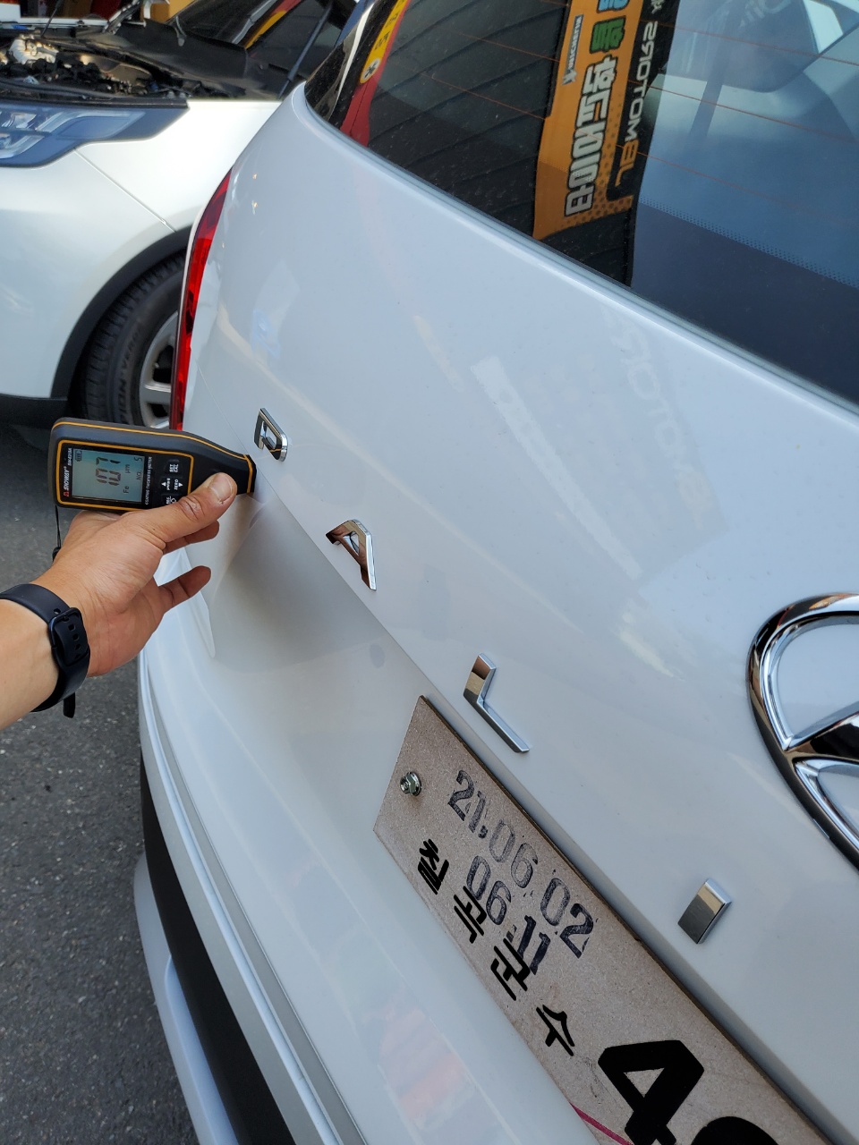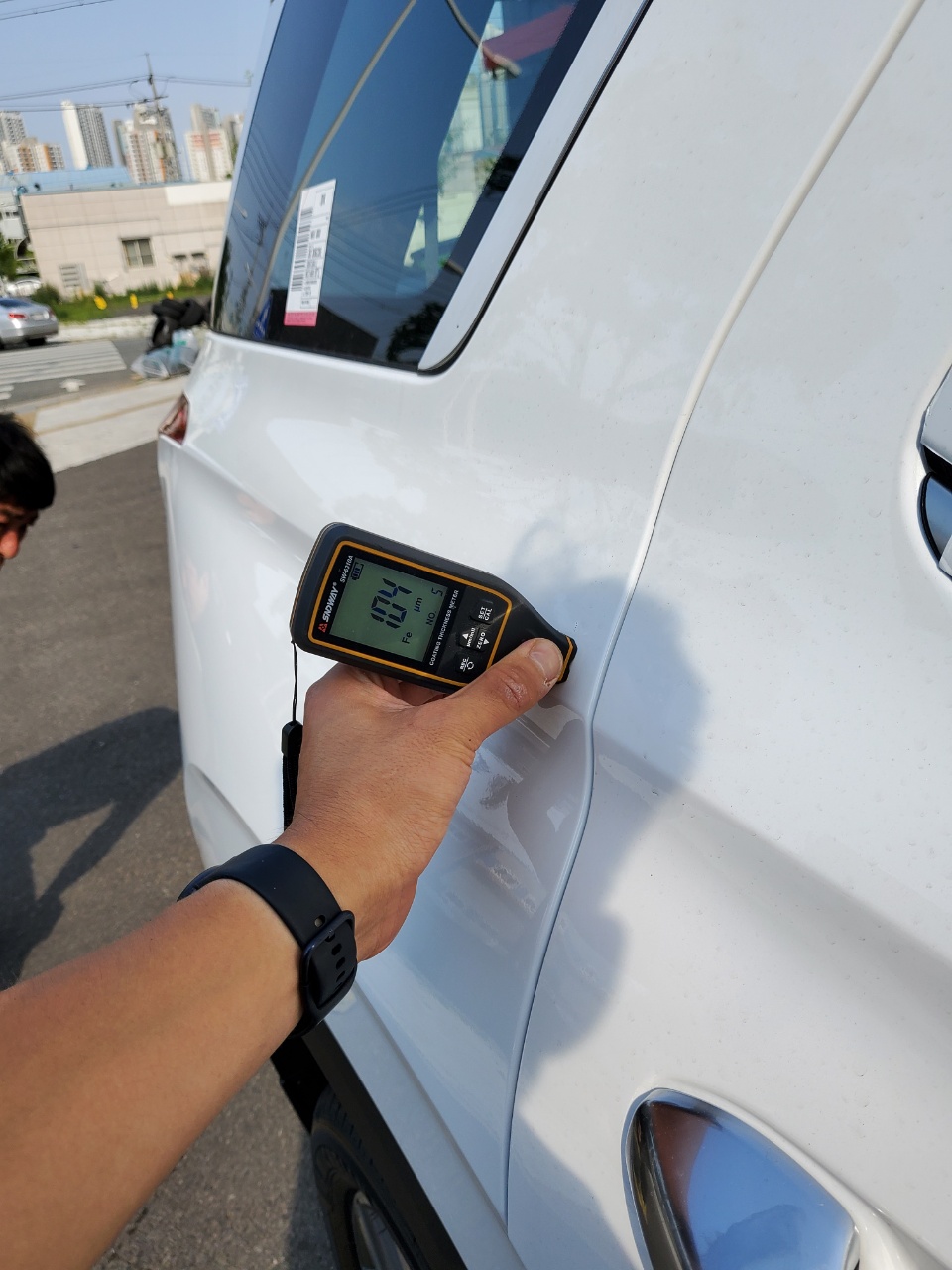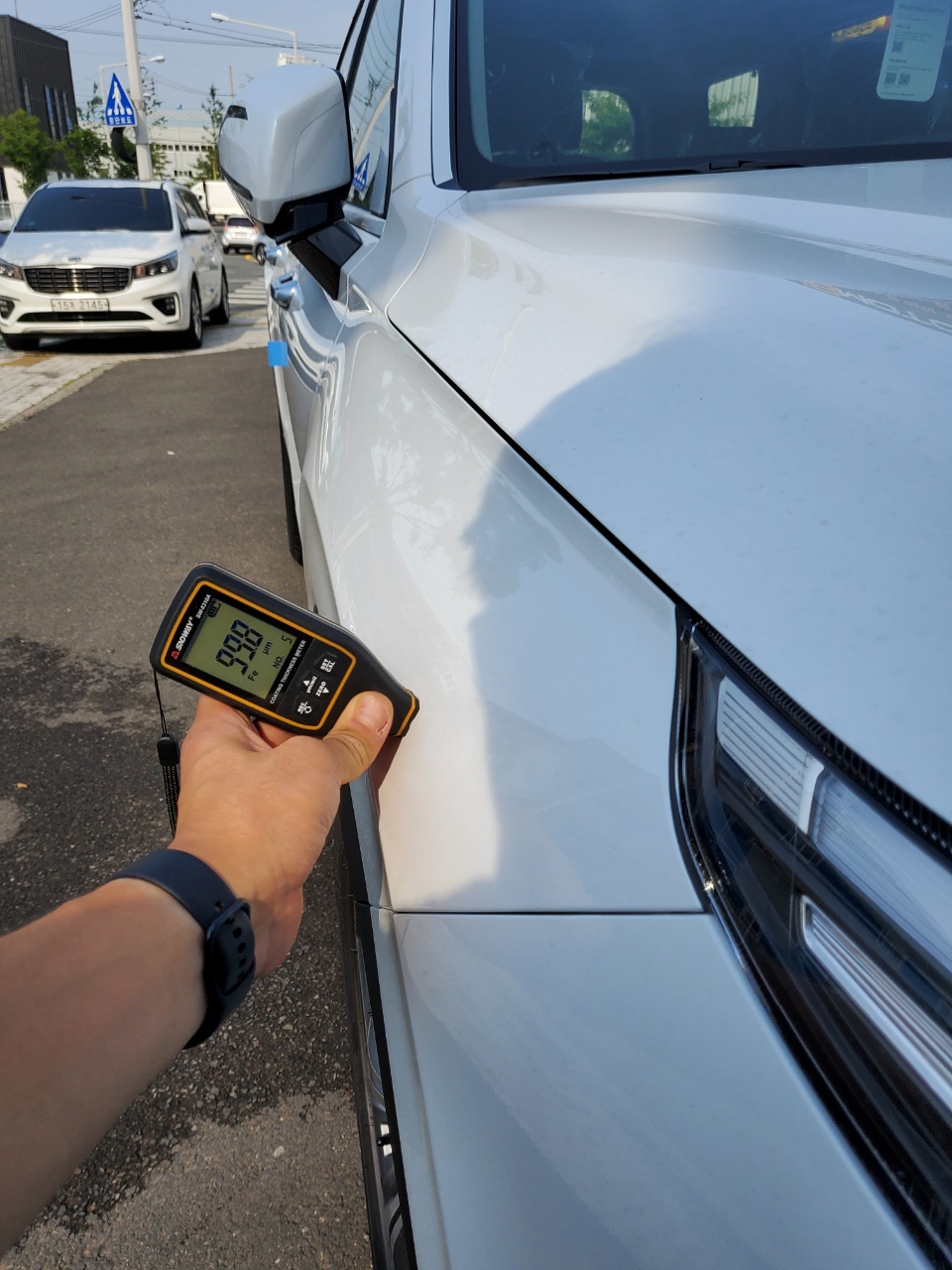도막측정기에 측정된 도막 두께가 일정하지 않으면 뭔가 이상한 것이라는 이야기다. 이를테면 제조과정에서 흠집이 생겼거나 기타 문제로 두번 도장이 되었다던가 하는 경우 이것으로 알 수 있다. 저 조그만게 꽤 비싸다고 알고 있다.