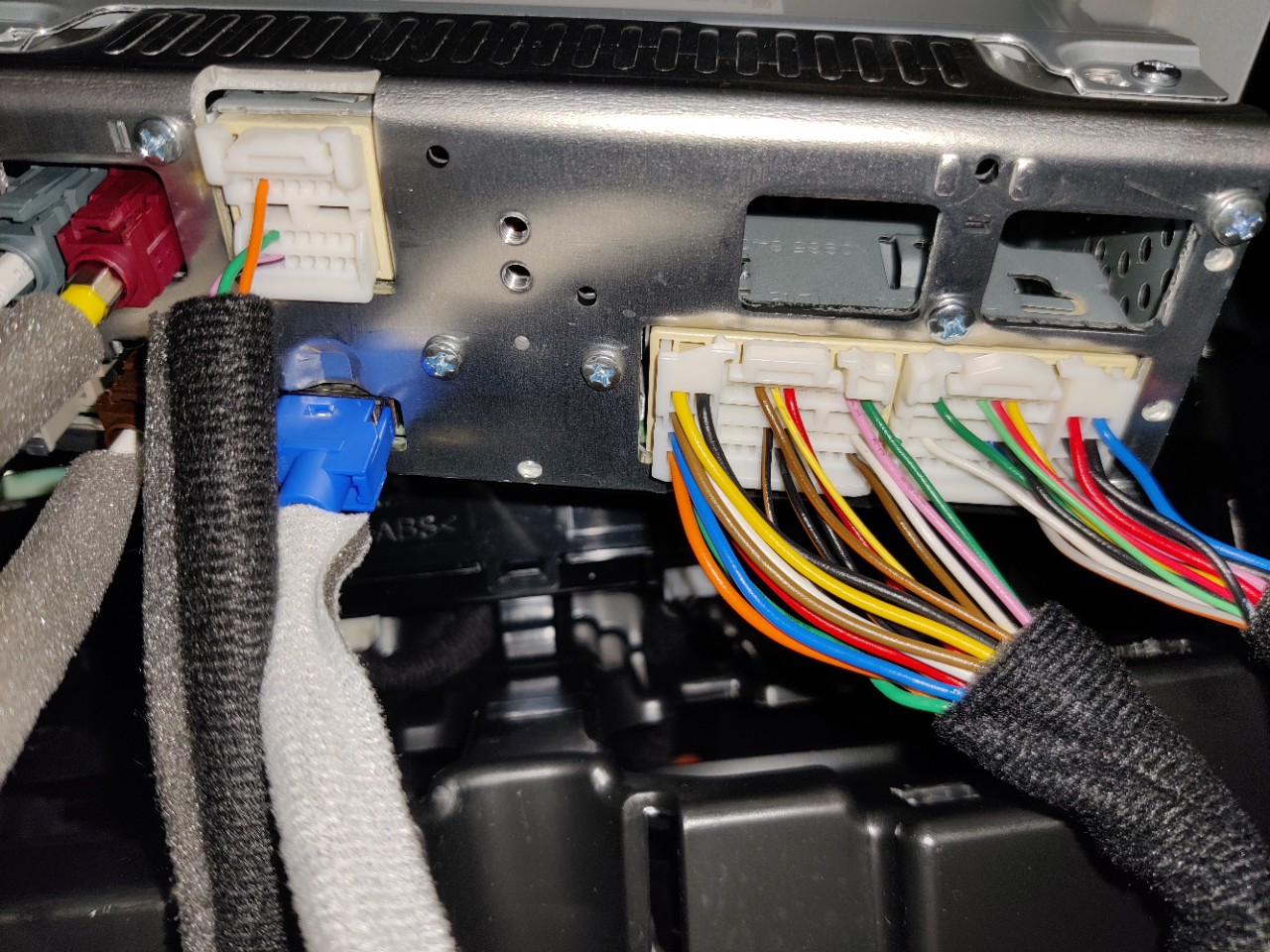 네비게이션 커버를 분리하고 네비게이션 양쪽 나사 4개를 풀러낸 다음 살포시 네비를 당겨내면 네비(aka AVN)가 빠지게 되고 그 뒷면에는 위 사진처럼 다양한 커넥터가 연결되어있습니다. 나중에 조립할 때 위치 헷갈릴까봐 커넥터 빼기전에 사진을 찍어두었습니다. (하얀커넥터는 걱정을 안했는데, 나중에 보니 안쪽에 색상이 다 짝지어 있어서 헷갈일 일은 없었을 것 같네요)