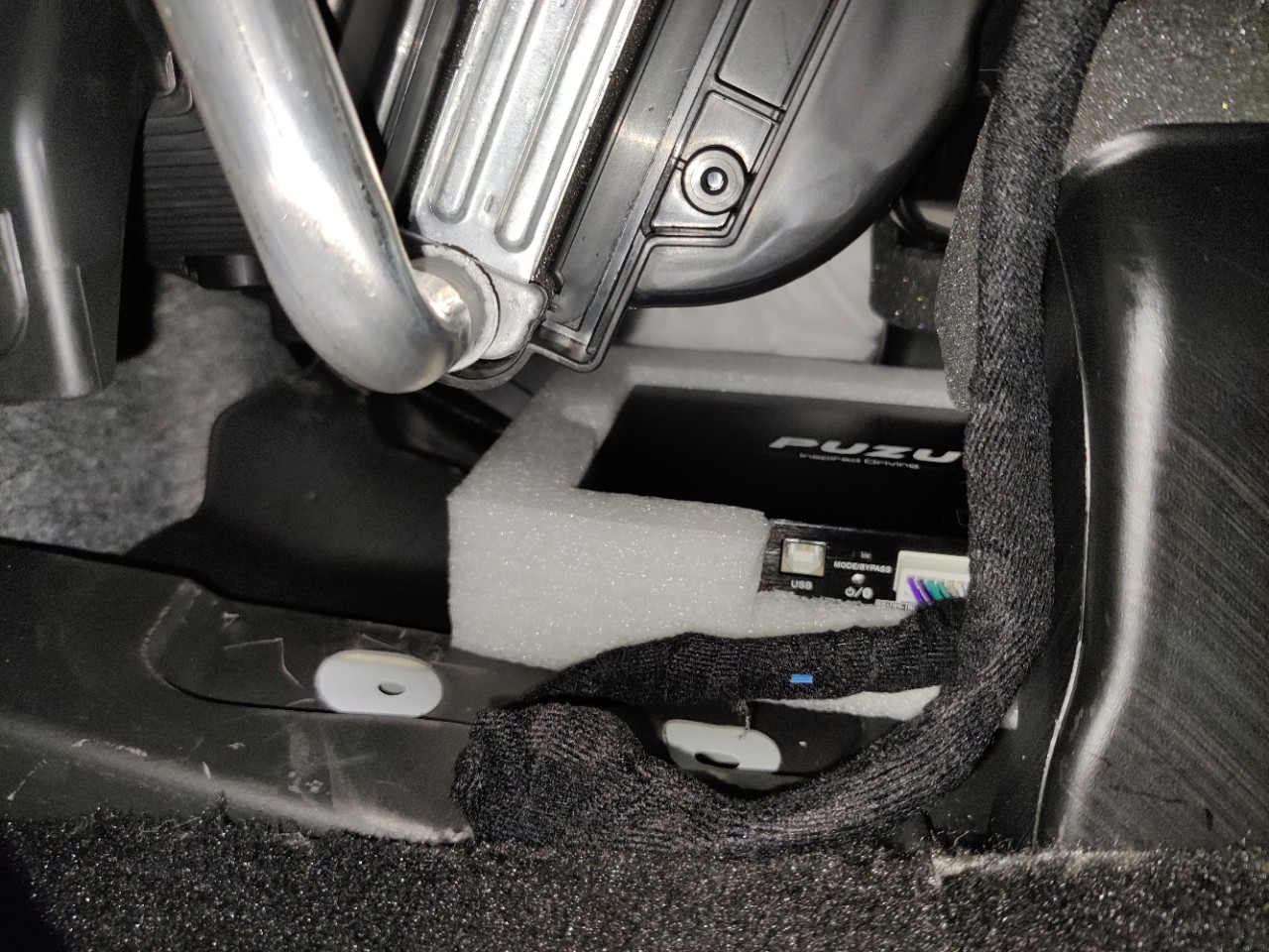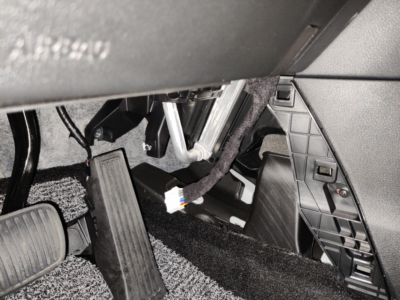 PUZU DSP를 이미 설치한 선구자분들은 dsp의 위치를 조수석 다시방과 이 곳중에 설치하신 분들이 많았습니다. 다시방에 이미 에프터블로워가 설치되어있던 터라 dsp까지 추가되면 수납공간이라는 역할이 무색해질것 같아서 아무래도 이쪽이 좋아보였습니다. 소음을 방지하고자 십년 넘게 가지고 있던 흡음방지 테이프를 칭칭 감아주고, 페달옆 중앙부분 빈공간쪽으로 배선을 내렸습니다. (이리저리 막 쑤시니까 내려오더라구요)