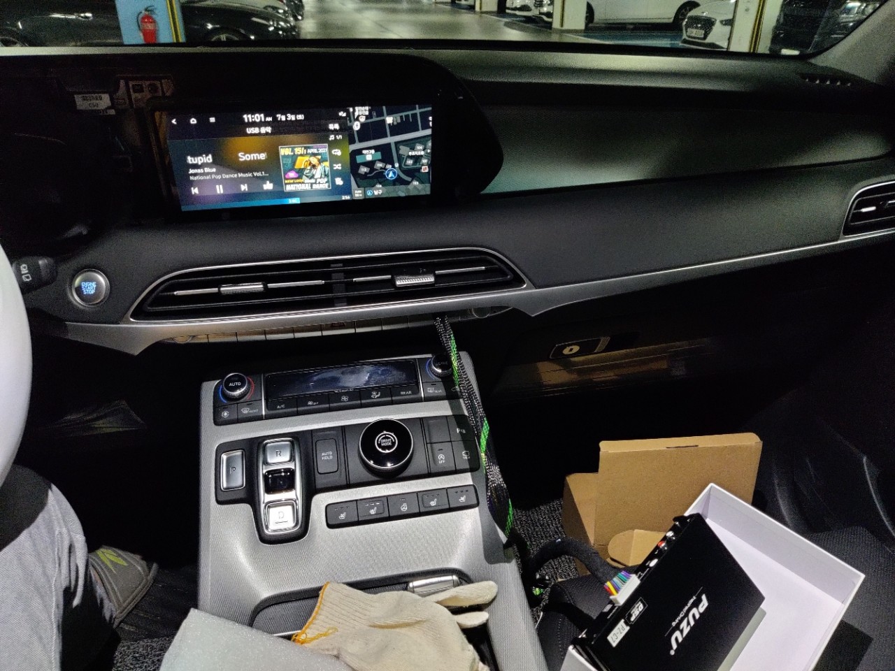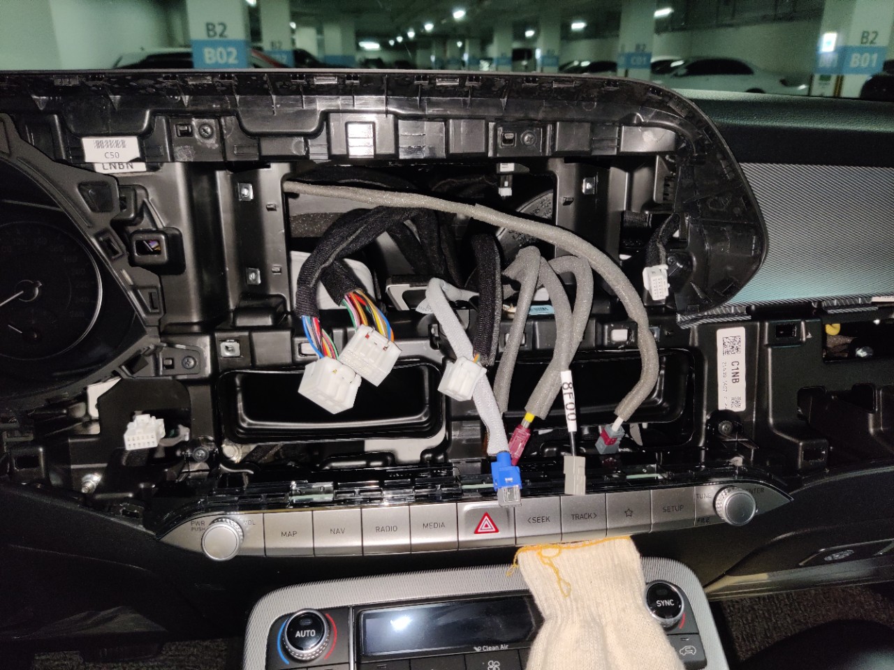 제품 제조사에서 준 Y케이블을 연결하고 Puzu DSP를 임시로 연결한 뒤에 동작을 테스트 합니다. 동작 테스트를 하려니 시동버튼이 필요해서 임시로 버튼이 있는 송풍구 커버를 살짝 걸쳐놨습니다. 테스트 해보니 매우 잘 됩니다. 음질 음감 부분은 뒤에 후술하겠습니다.
