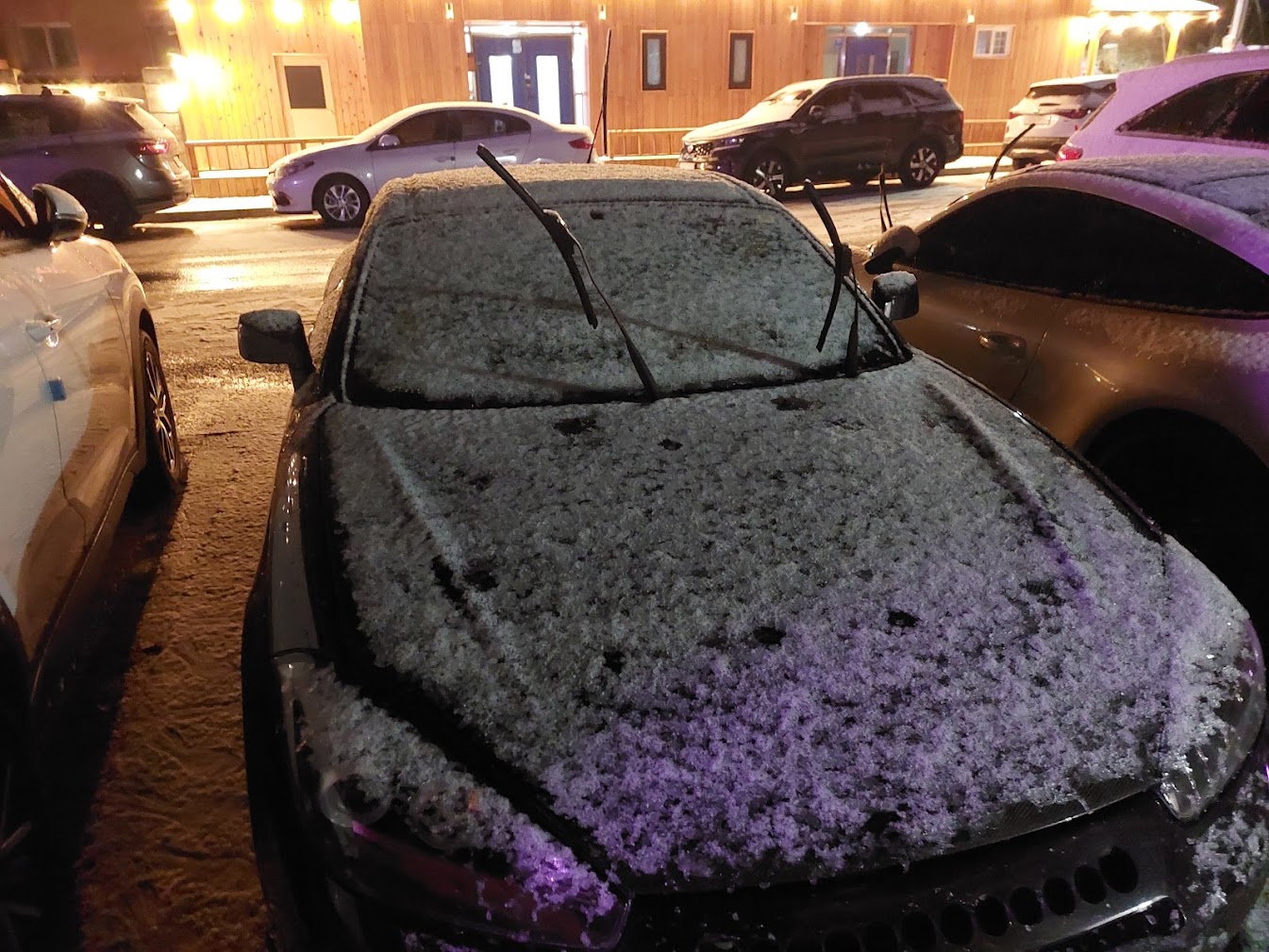 거기다 사진상 표현되듯이 조금 녹다가 얼어 붙어버린 상황.. 내일 아침에 태백 서킷까지 올라갈수는 있을까, 아니 설포지 타이어로 태백서킷까지 갈수는 있을까 걱정하면서.. 일단 유리에 얼어붙은 눈/얼음만 다 긁어내고 다시 일단 눈을 붙인다.