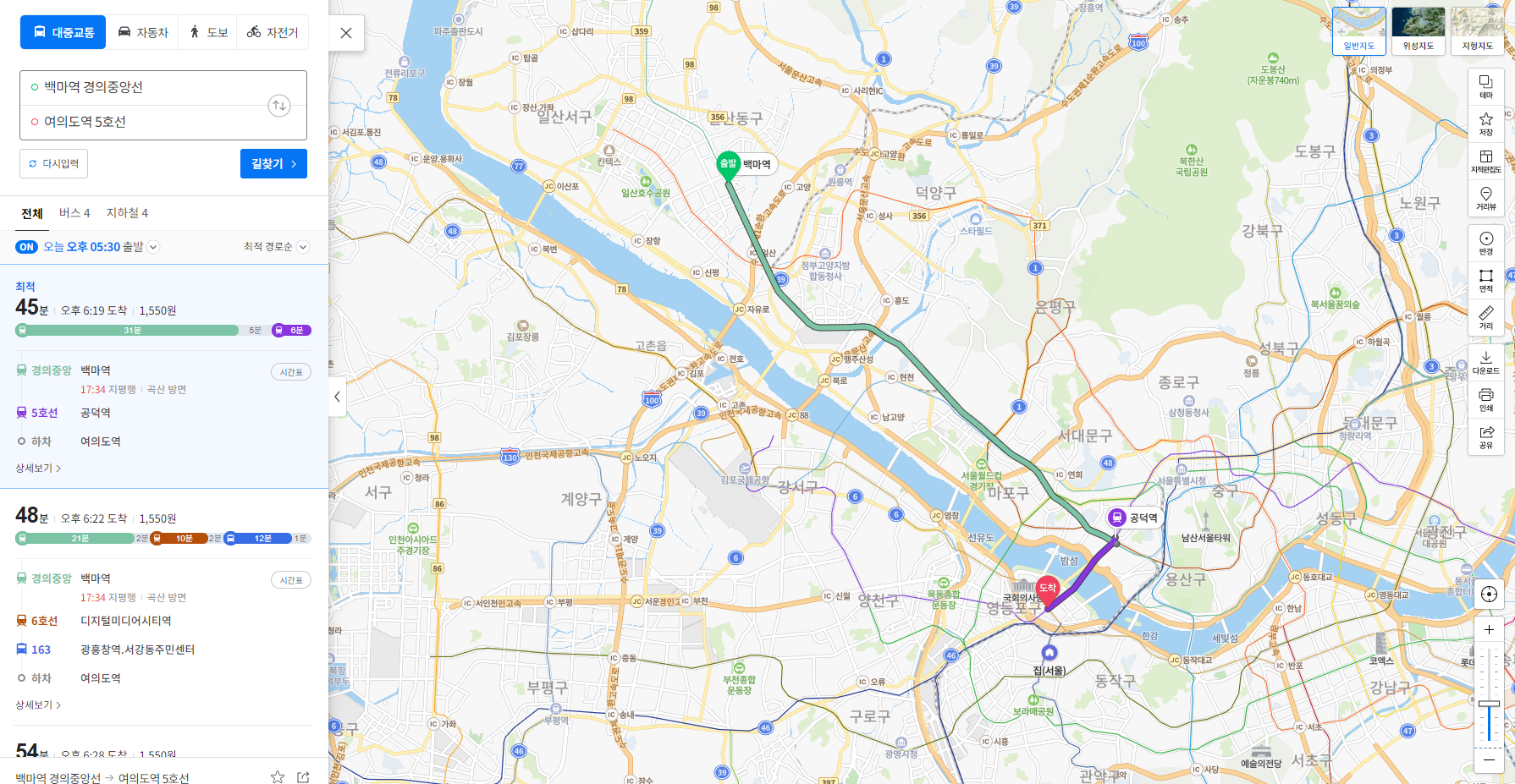 검토를 시작하면서 처음에 일산에 대한 나의 지식은 과거의 기억만 있었기 때문에 여의도로의 출퇴근이 버스(당산환승)에 의존하던 기억이었다. 그래서 일산에서 출퇴근을 잘 할 수 있을까 하는 의문이 있었다. 그런데 막상 네이버 대중교통 길찾기 기능으로 여의도를 검색하다보니 경의중앙선에서 공덕 5호선 환승으로 여의도 접근이 가능하다는 것을 발견하게 되었다.