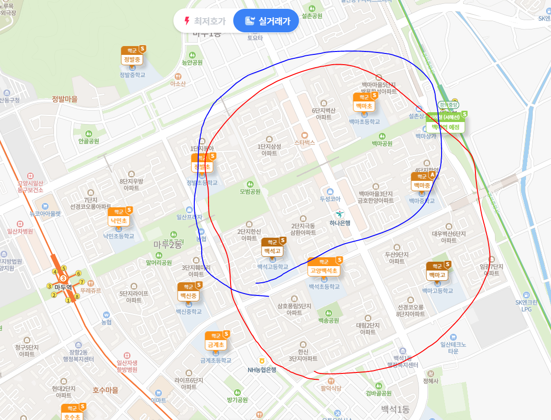 넓게 보자면 빨간 색칠한 구역, 좀 더 작게 보자면 파란색 구역이 백마 학군의 직접적인 단지들이다.