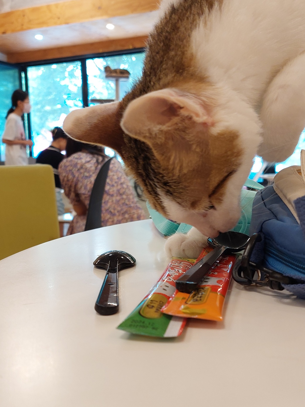 3인 입장료와 츄르를 2봉지(3000원) 샀다. 다행히 빈 테이블이 있어서 자리를 잡았더니 츄르용 플라스틱 숟가락을 보고 반사적으로 고양이들이 뛰어온다.