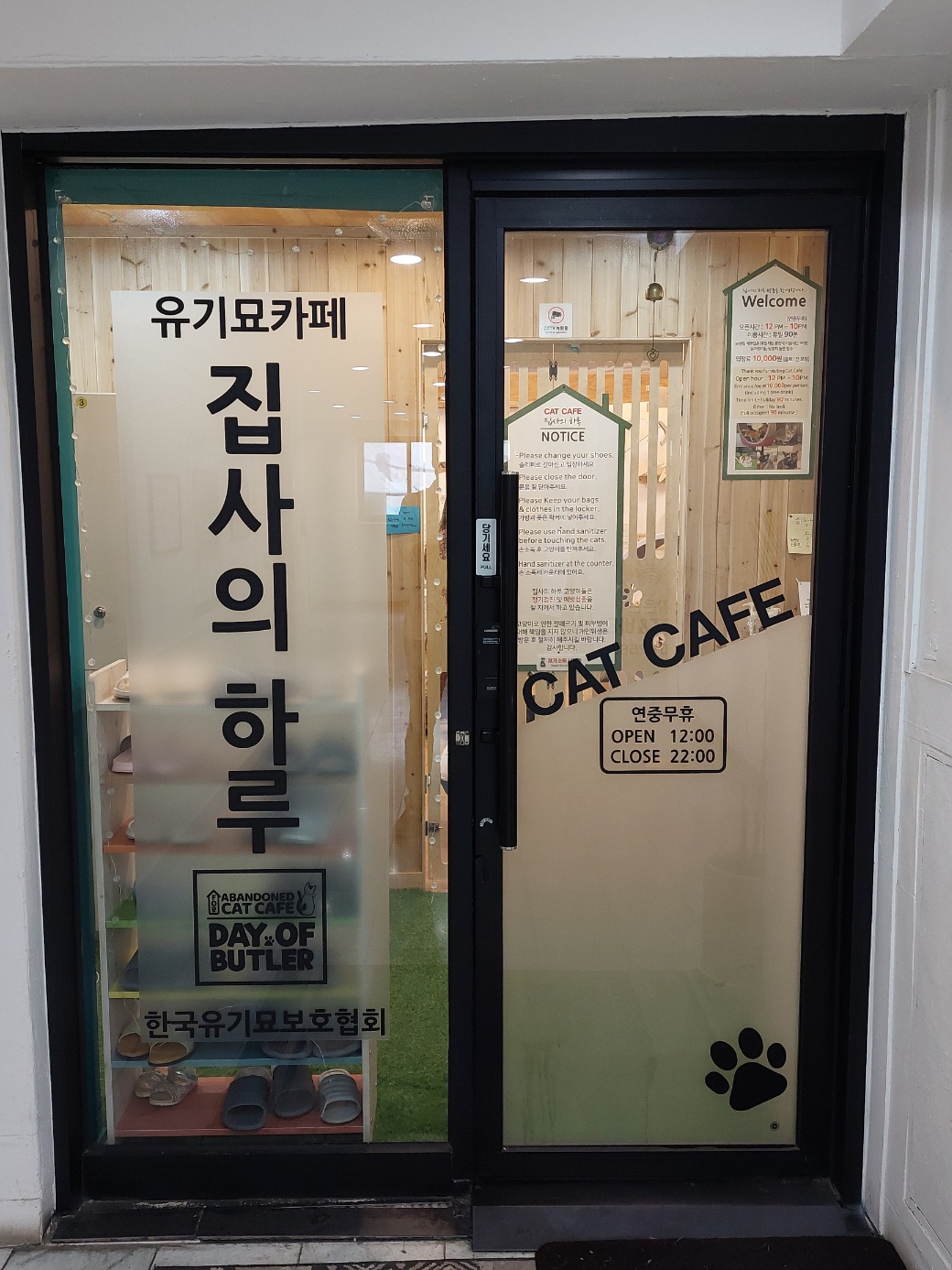 입구에 들어서면 슬리퍼로 갈아신고, 고양이와 사람을 위해 손소독을 필수로 하고 있다. 슬리퍼로 갈아신고 손소독을 마치면 밖으로 탈출(?)하고 싶은 고양이들을 잘 피해서 입구로 들어가면 된다.