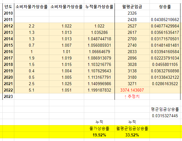 이 표는 년평균 물가상승률과 임금 상승률을 나타낸 표이다. 일부 최신 년도의 경우는 추정치도 있기는 하나, 큰 틀에서 보면 물가상승률은 약 20%, 평균임금상승률은 33%정도로 볼 수 있다.