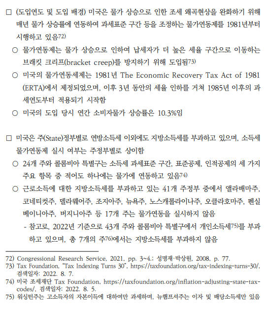 내용상에 보면 물가상승으로 인해 납세자가 더 높은 세율 구간으로 이동하는 브래킷 크리프를 방지하기 위해서 소득세 과표기준에 물가연동을 하고 있다고 적혀있다.