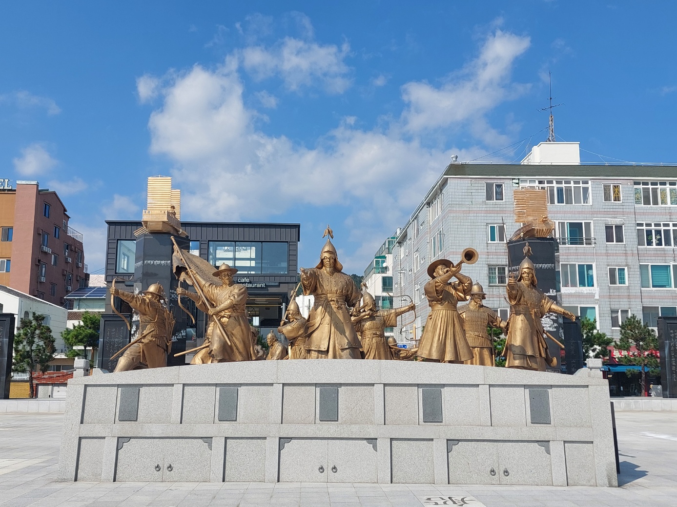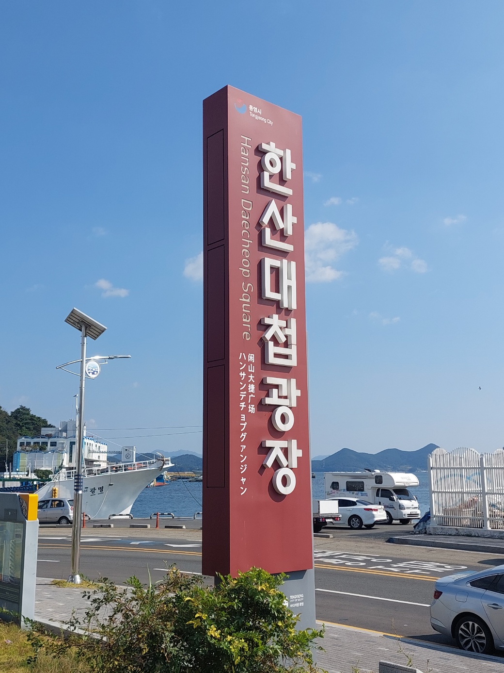 마지막에 대전-통영고속도로를 달려 통영에 도착하고 주차할만한 곳 없을까 하고 가다보니 "한산대첩광장" 공영주차장이 나왔다. 외부에 불법주차된 차가 많았지만, 나는 준법시민이므로 공영주차장에 주차를 하고 나와서 잠시 광장을 둘러봤다.
