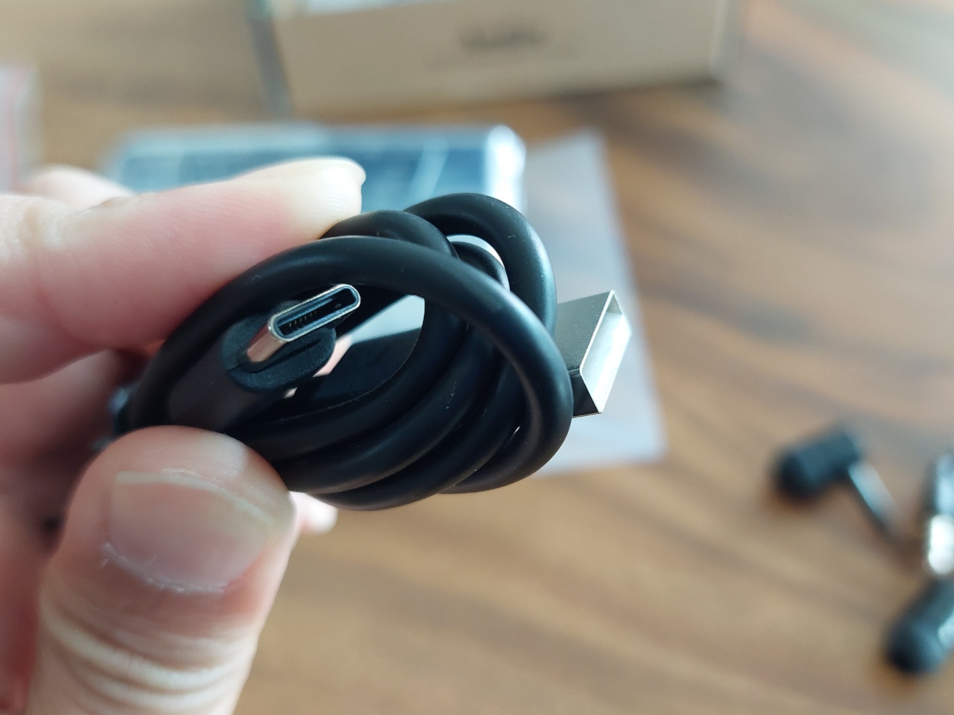구성품은 박스, 본체, 이어폰, USB C 케이블, 설명서다.