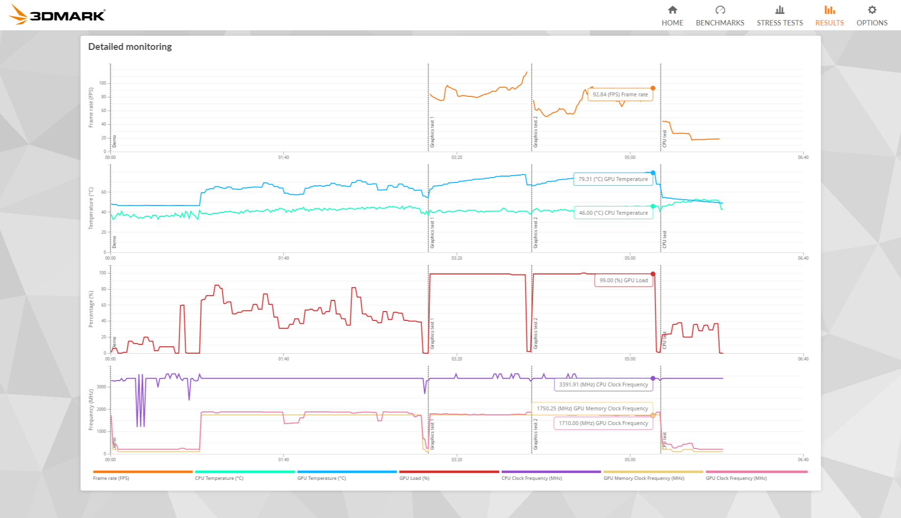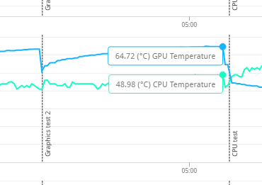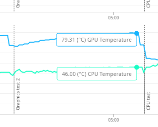 3d mark 점수는 대략 13000점 정도 되었던거 같은데, 이 점수가 중한것이 아니고 나는 온도에 관심이 있었다. 가장 마지막 테스트의 피크 온도를 보면 79도를 넘는 것을 확인할 수 있다.