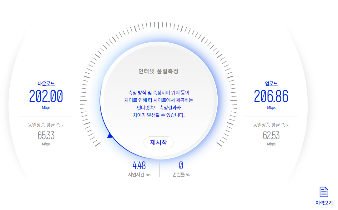 우리집 인터넷 상품이 200메가짜리인데, 200메가를 넘어서는 속도를 보여준다. 오....................................