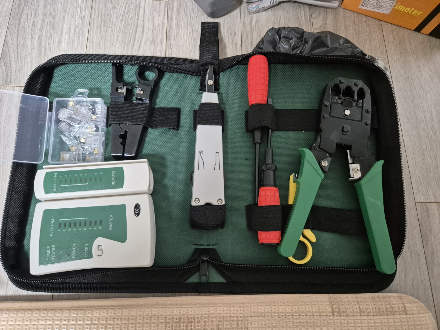 RJ45와 전화선커넥터가 각 10개씩 서비스로 들어있는 구성. RJ45는 CAT6 지원되는 커넥터가 중국에서 오고 있는데, 일단 참기 어려우니 바로 동봉되어있는거 사용해서 찝어서 테스트.