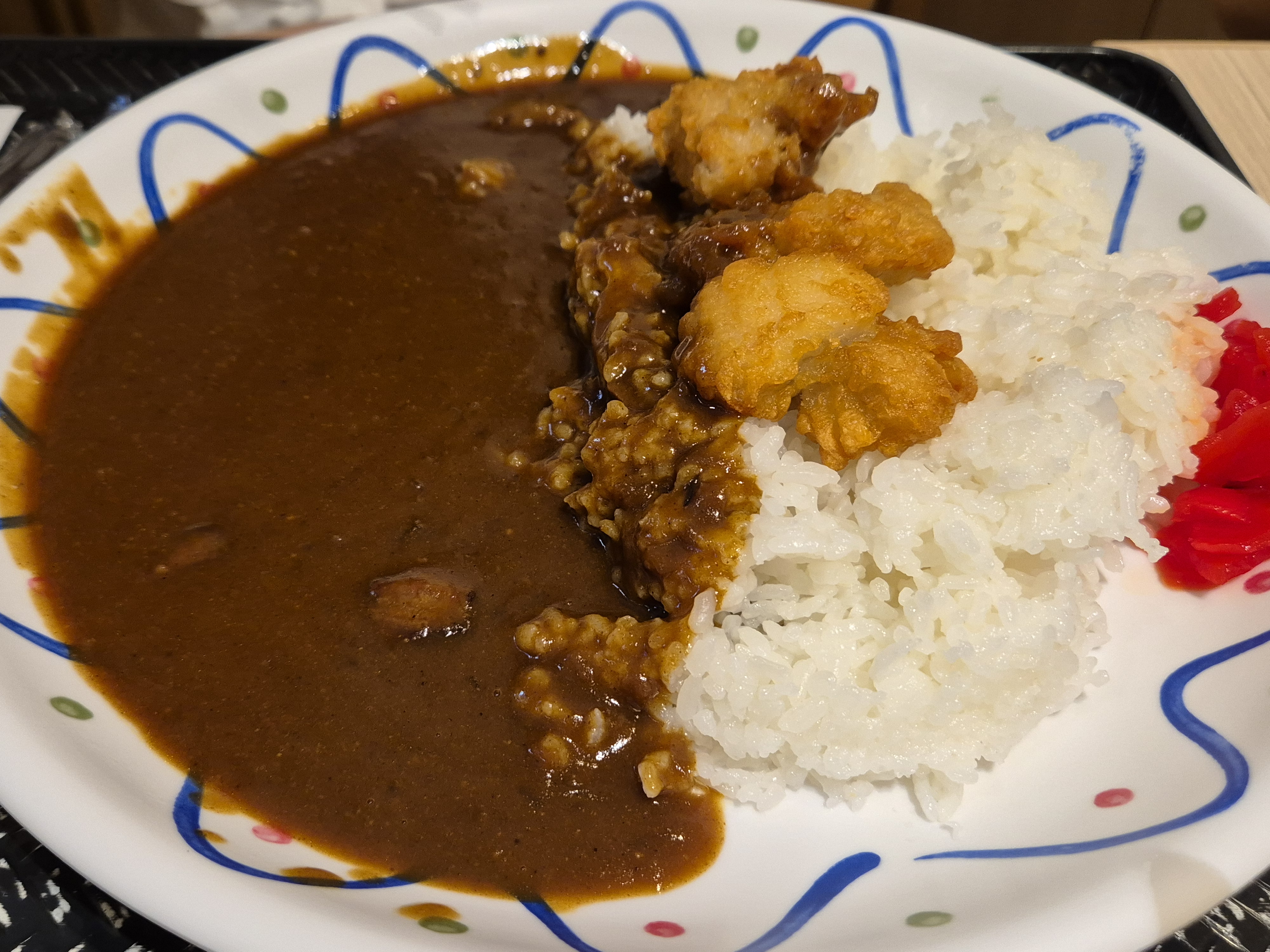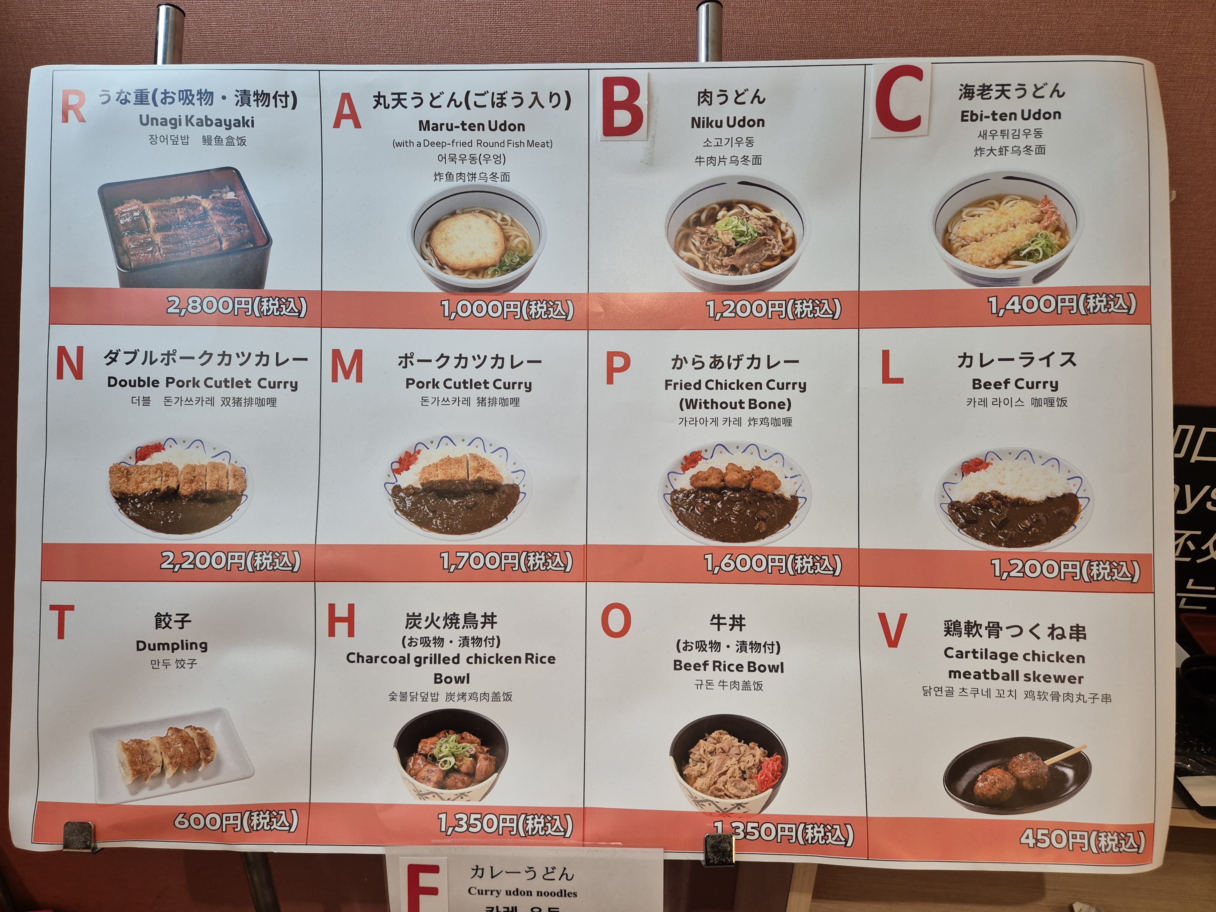 우리는 C, M, P, H를 시켰다. 새우튀김우동, 돈가쓰카레, 가라아게 카레, 숯불닭덮밥.