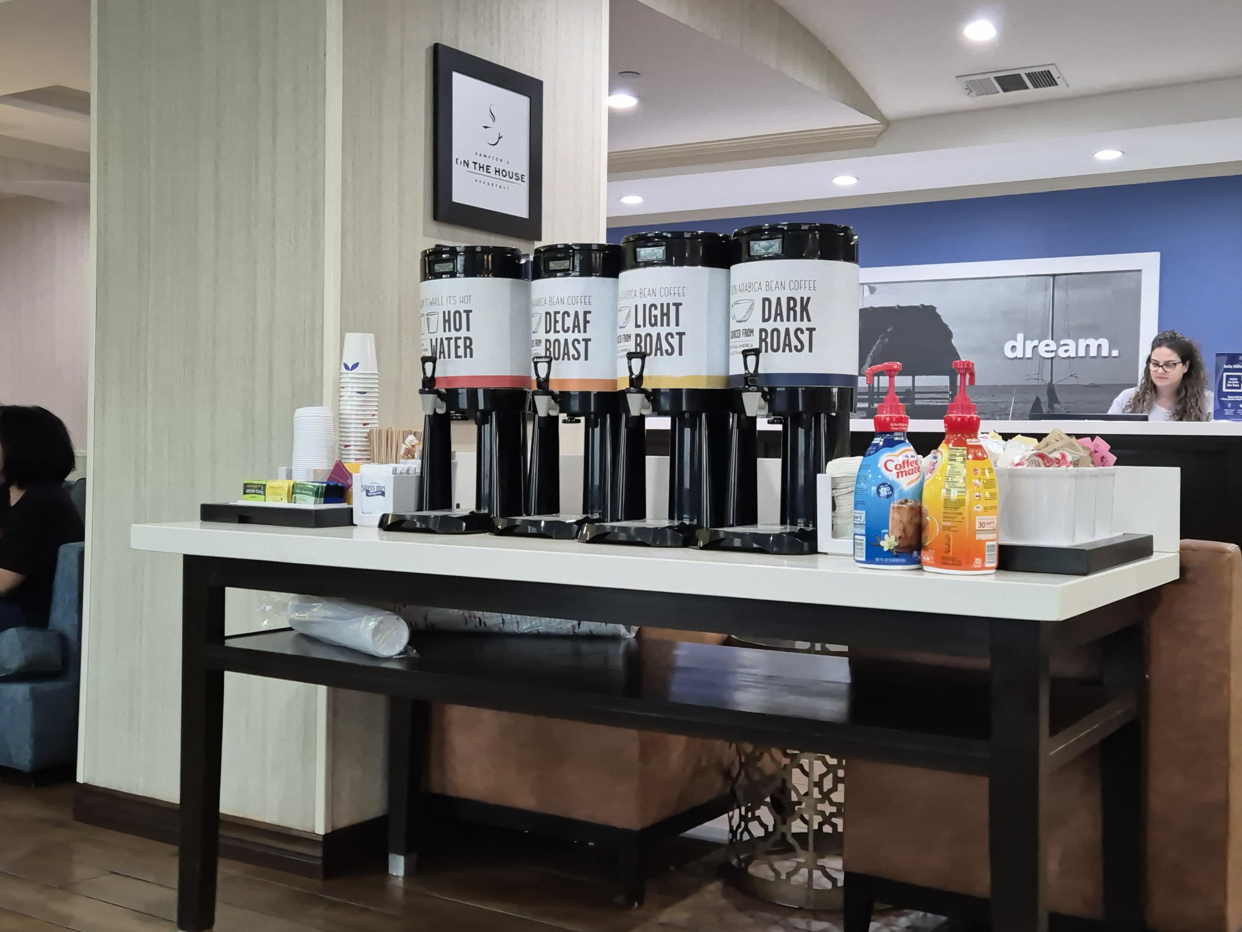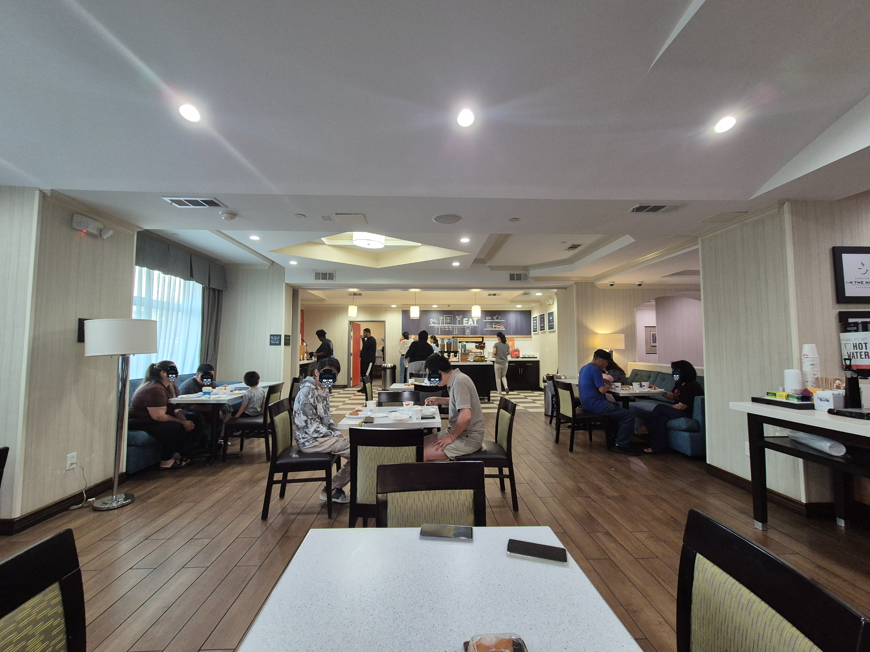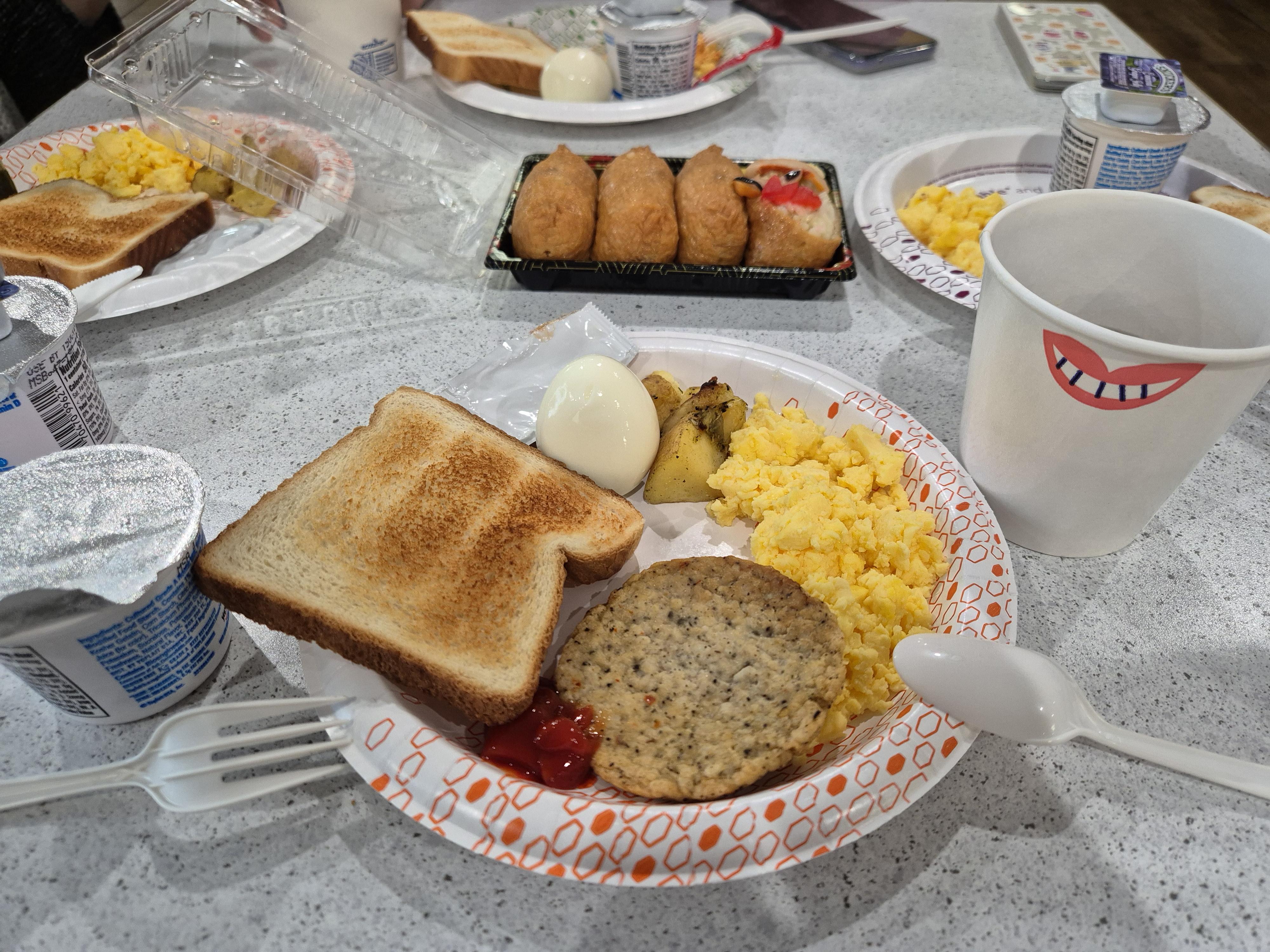 미국에 왔으니까 아메리칸 브렉퍼스트를 먹어주는 것이 인지상정. 어제 밤에 H마트에서 사뒀었던 유부초밥도 가지고 내려와서 함께 취식. 미국식 호텔에서는 대부분 1층에 커피가 항상 비치되어있어서 좋았다.