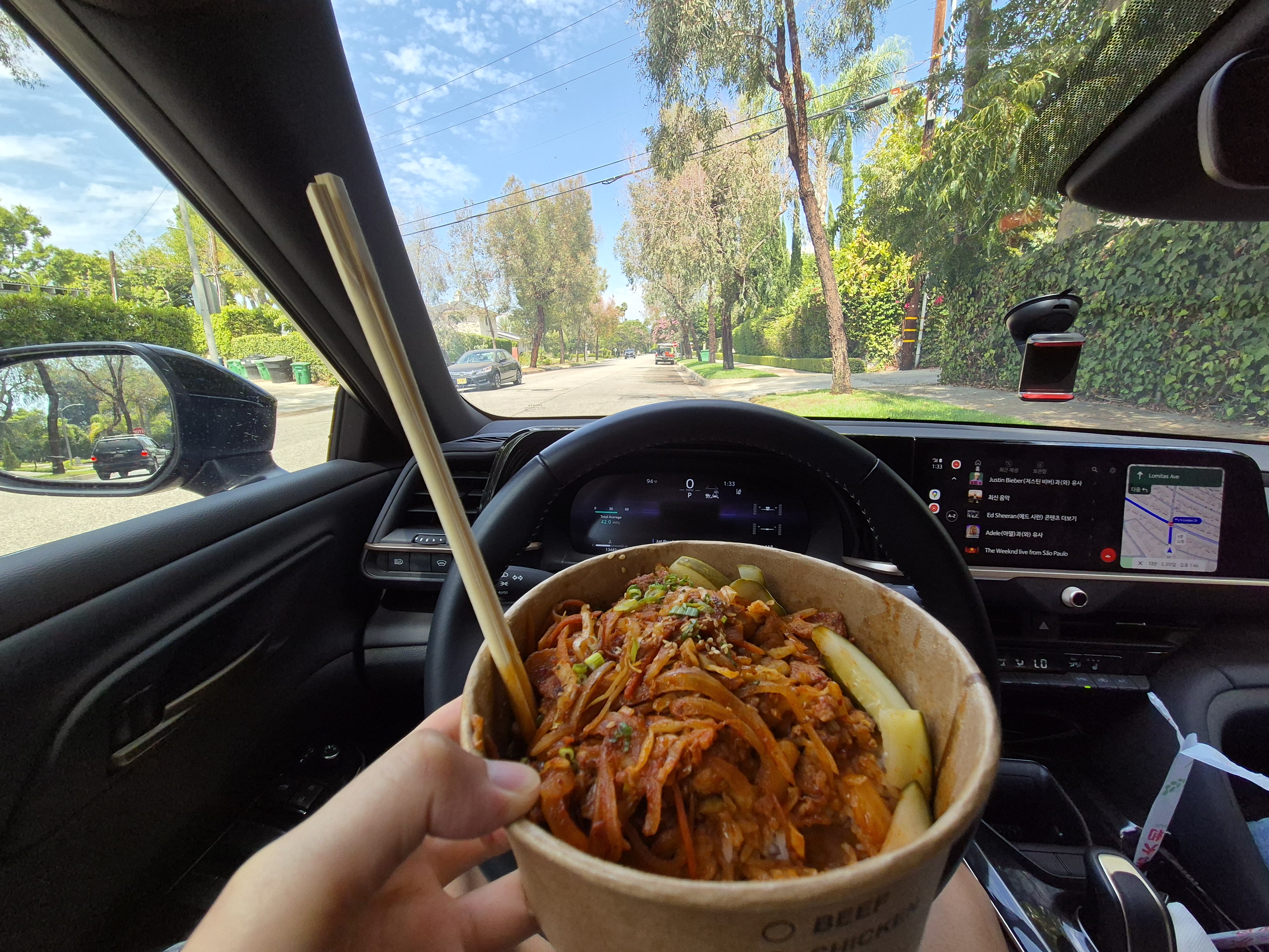 게티센터는 오후 3시로 예약했기 때문에 시간이 남았는데, 가족회의 결과 한식을 먹고싶다해서 근처 한식집에서 밥을 포장해서 차안에서 먹기로. 기왕 먹을거 비버리힐즈 구경도 겸하기위해 비버리힐즈로 이동해서 드라이브하다가 길가에 차를 대놓고 밥을 먹었다.