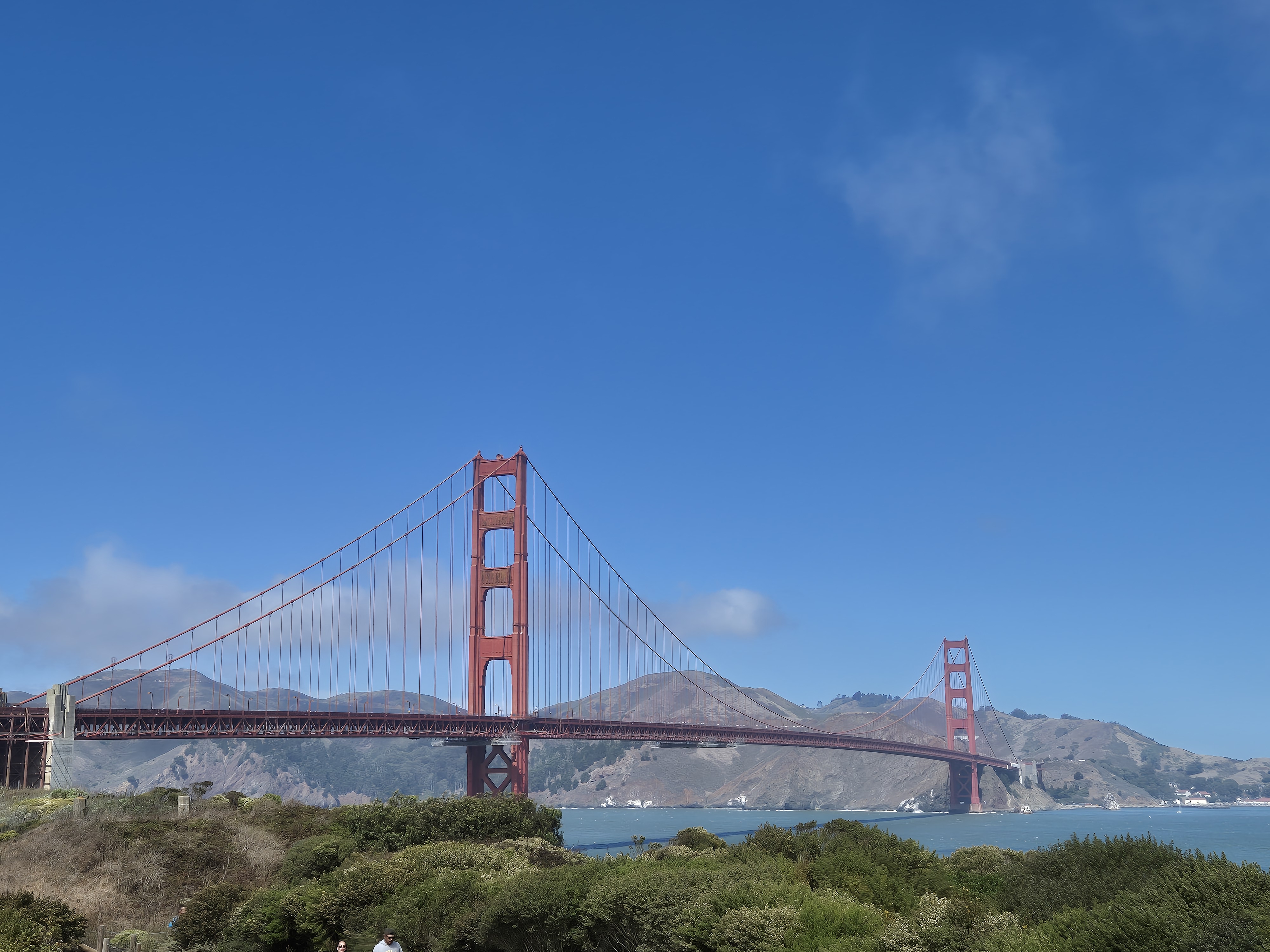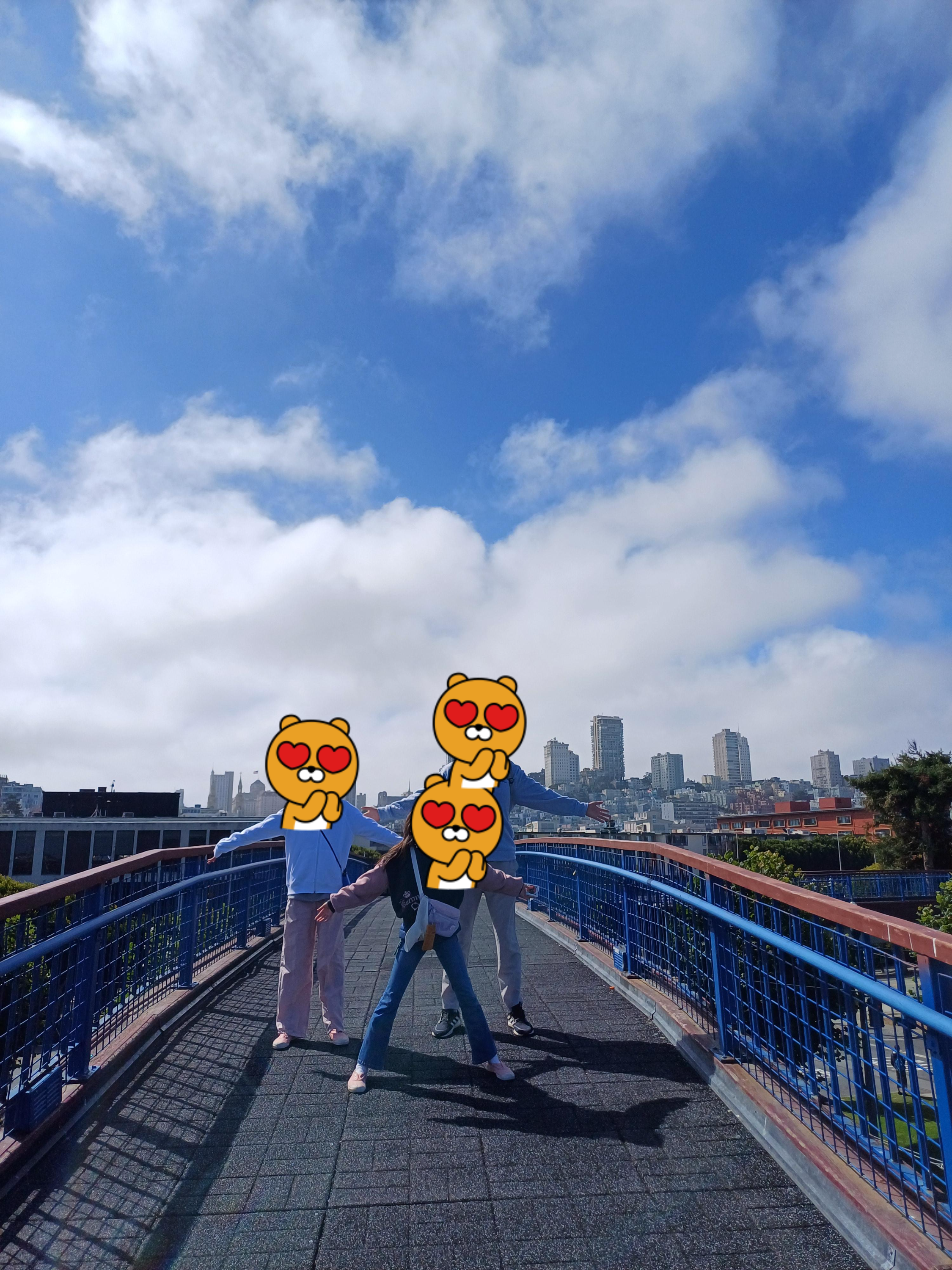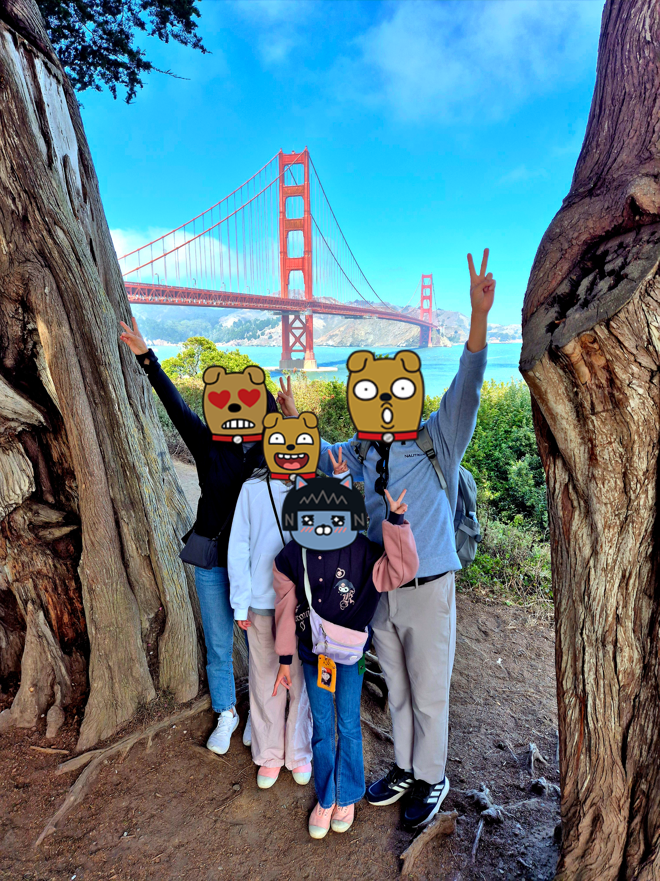 햇빛을 받아 빨갛고 예쁘게 나온 금문교 사진을 잘 찍었다. 그리고 마음씨 좋은 사람 만나서 예쁜 가족사진도 한 장 얻었다. 금문교를 지을 당시에 썼던 현수교의 부품에 대해 아이들에게 설명도 해주었다.