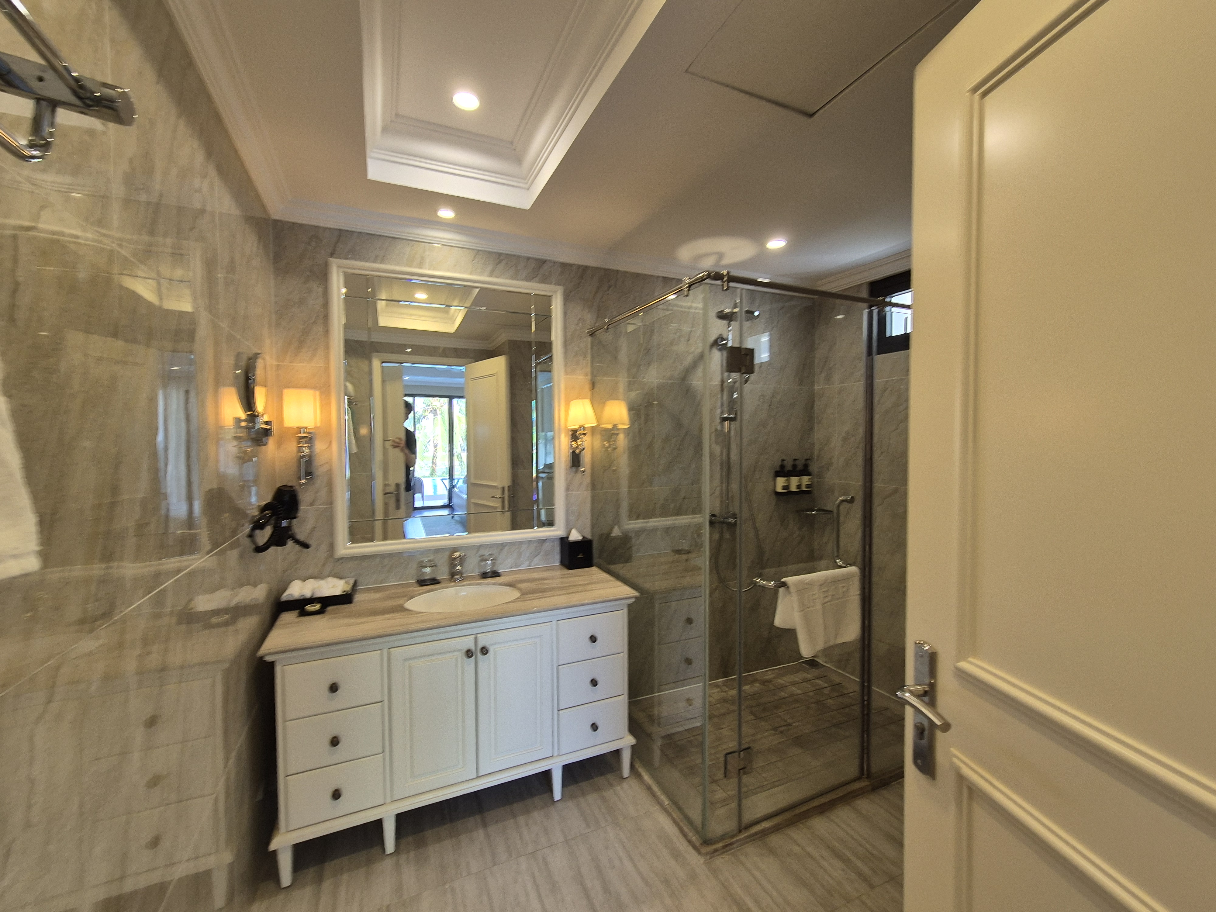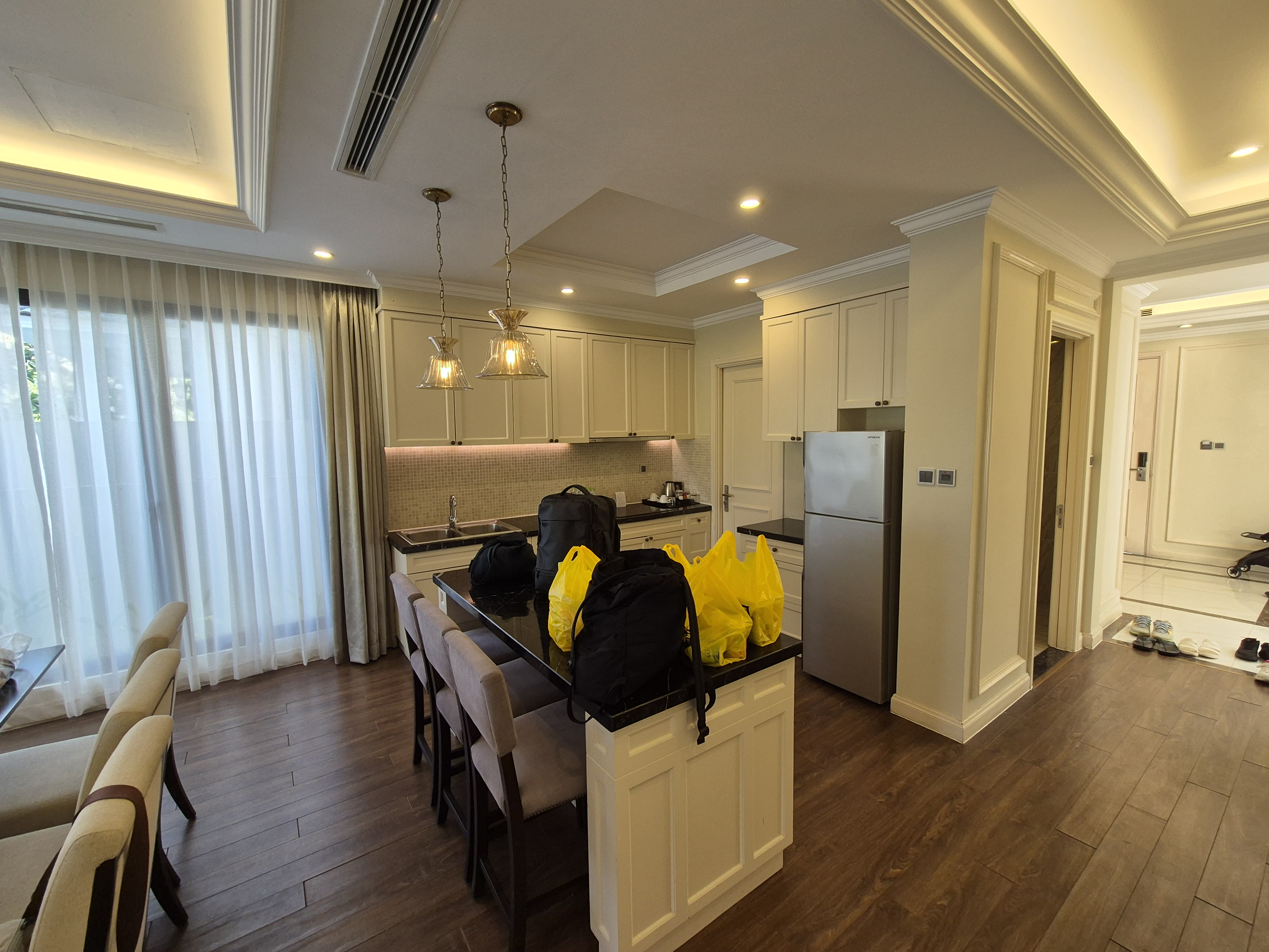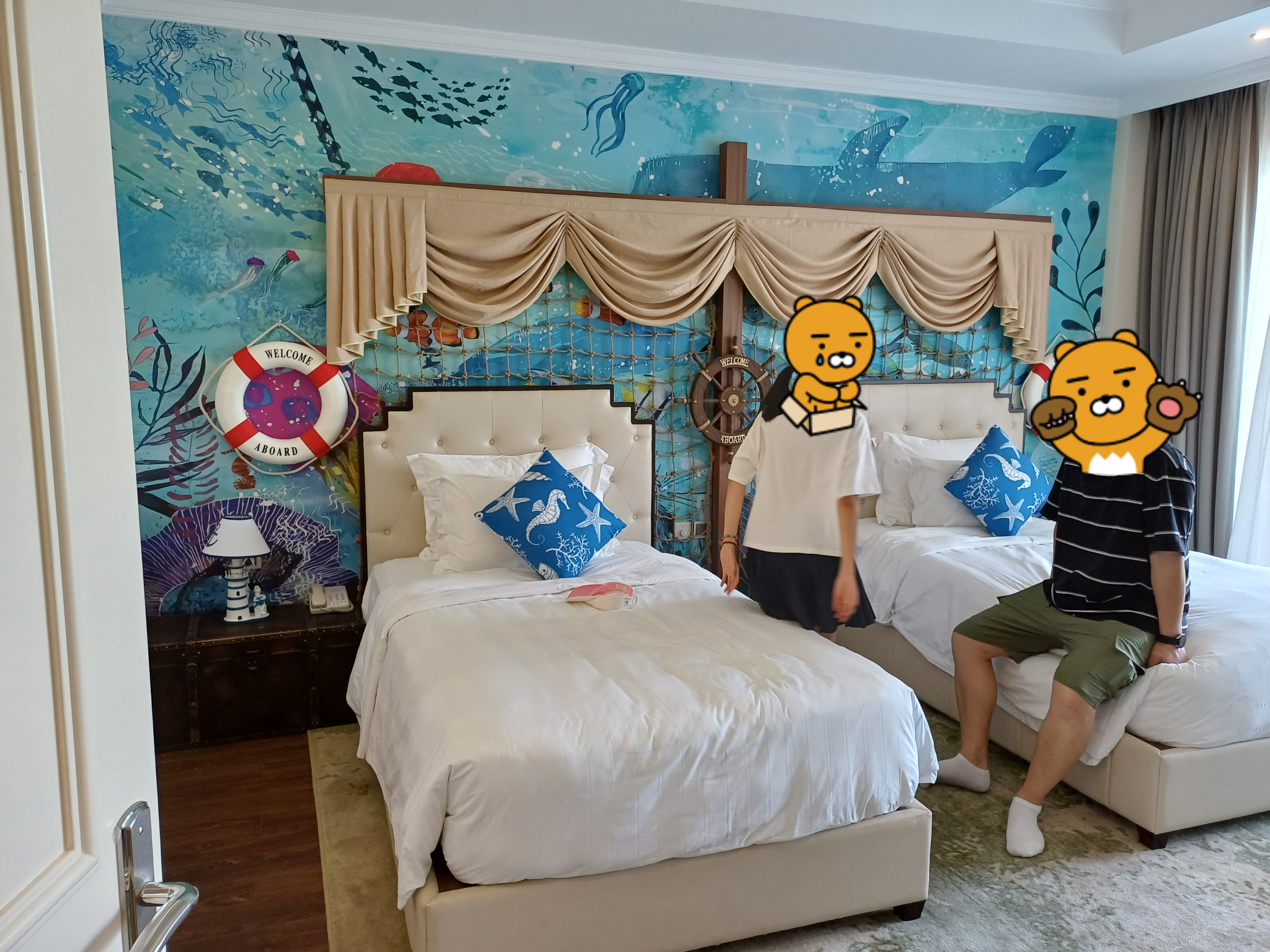 원더월드 4베드룸 풀빌라는 당시 박당 45만원정도였던 것 같은데, 9명 3가족이 한번에 묵기에는 딱 좋은 구성이었던 것 같다. 아이가 어린 처제네를 1층방으로하고, 우리 1,2호기를 방하나 따로, 나랑 와이프가 방 하나따로, 장인장모님을 방을 하나로. 4베드룸에 화장실이 5개라 매우 쾌적하다.