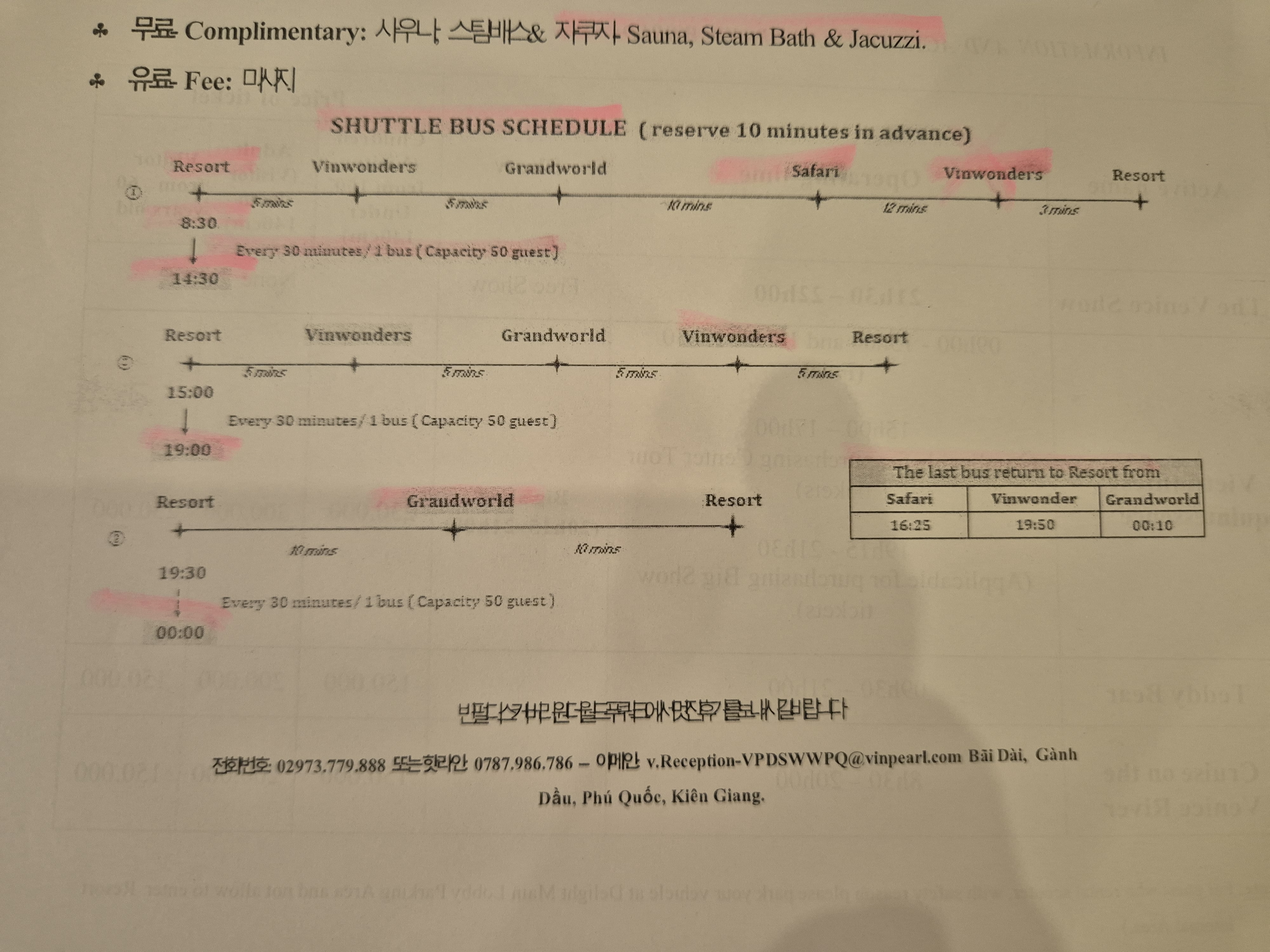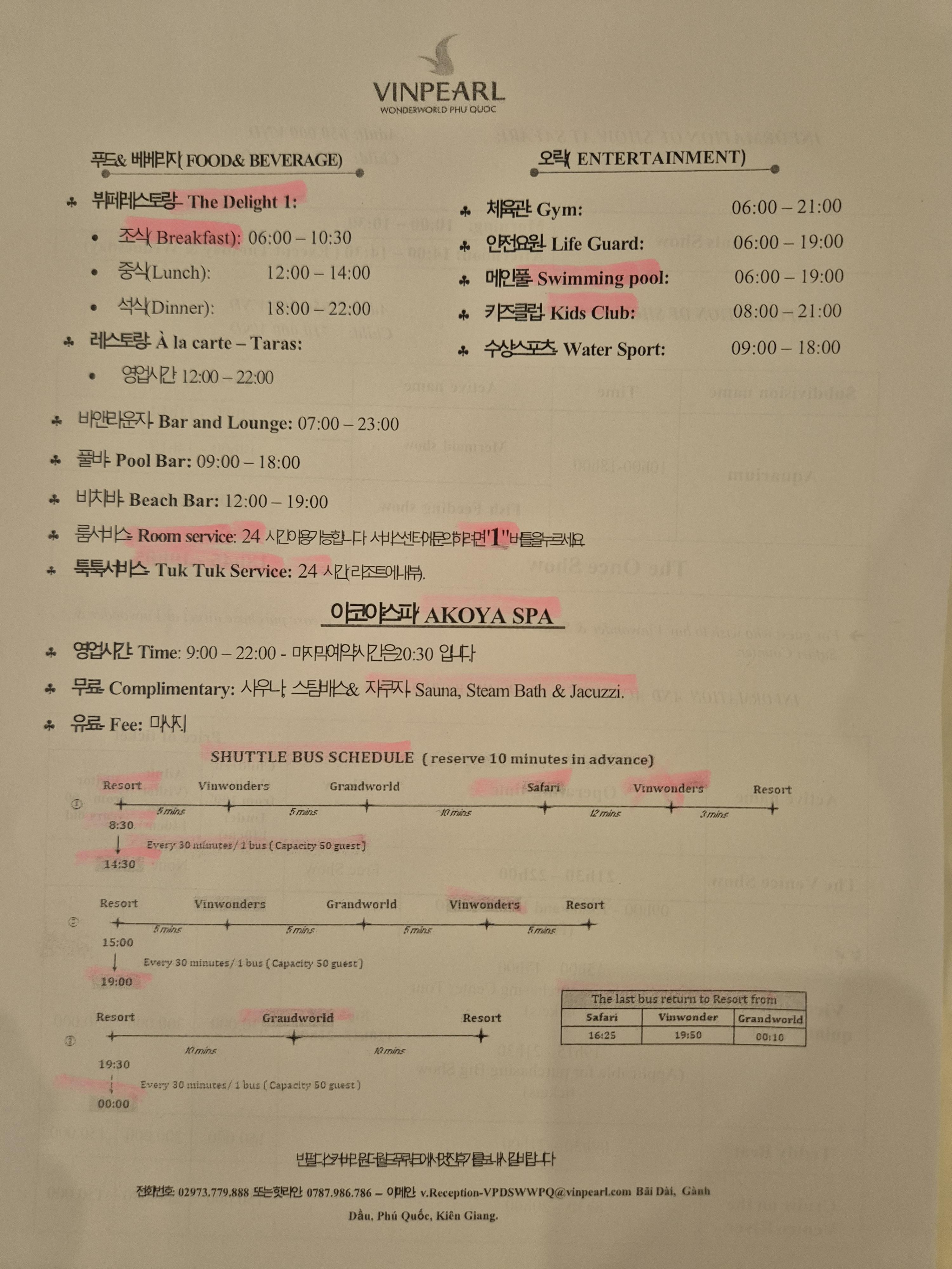 빈펄 원더월드 리조트 체크인때 받은 식사시간, 셔틀과 관련된 각종 정보는 아래 그림 참조.