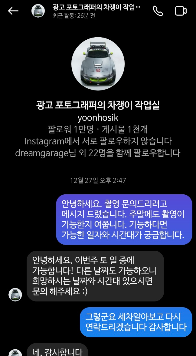 그리고 검색하다보니 근거리인 파주쪽에 유명한 스튜디오가 있다는 것을 깨달았다. 차쟁이들과는 SNS로 어느정도 친추나 팔로우가 되어있다보니 윤호식 작가님이자 드라이버님이 운영하는 스튜디오의 결과물들은 어느정도 이미 본적이 있었다. 그래서 바로 다음날 연락을 시도.