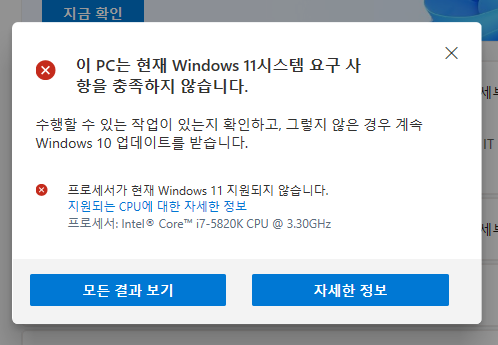 그랬다. 내 i7 5820k는 윈도우11이 공식적으로 지원하는 CPU가 아니다. 내가 CPU를 처음에 바로 확인하지 않았던 이유는