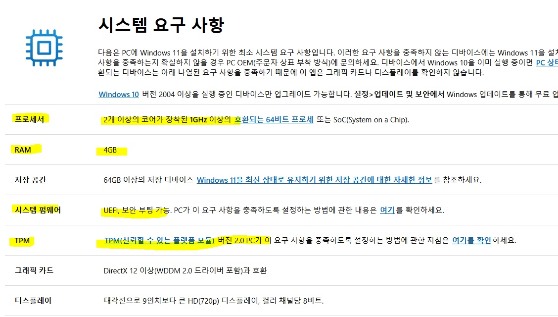 아무튼 메인보드에 이러한 것이 없기 때문에 공식적으로 윈도우11을 지원하지 않는 것이다.